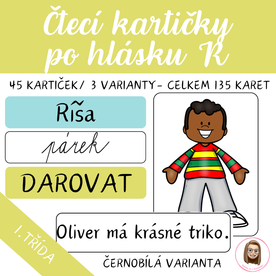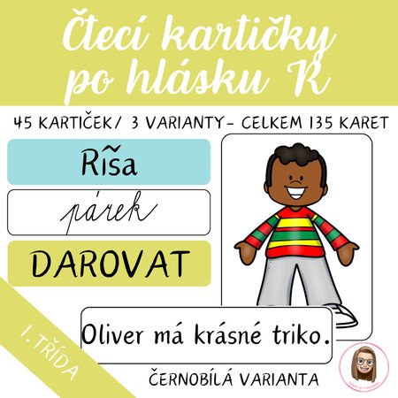 Čtecí kartičky po hlásku R, které dětem pomohou jistě a hravě zvládnout první čtenářské pokroky. Soubor obsahuje celkem 135 kartiček ve třech typech písma (velké tiskací, malé tiskací, psací) a k tomu šest vět s obrázky pro nácvik čtení s porozuměním. Nechybí ani pracovní listy k psaní písmene R, r a krátkých slov a vět.