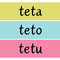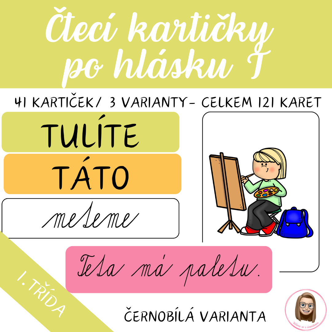 Čtecí kartičky po hlásku T, které dětem pomohou jistě a hravě zvládnout první čtenářské pokroky. Soubor obsahuje celkem 117 kartiček ve třech typech písma (velké tiskací, malé tiskací, psací) a k tomu čtyři věty s obrázky pro nácvik čtení s porozuměním. Nechybí ani pracovní listy k psaní písmene T,t a krátkých slov.