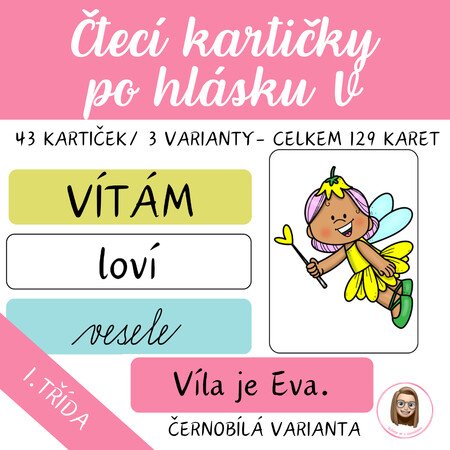 Čtecí kartičky po hlásku V, které dětem pomohou jistě a hravě zvládnout první čtenářské pokroky. Soubor obsahuje celkem 129 kartiček ve třech typech písma (velké tiskací, malé tiskací, psací) a k tomu čtyři věty s obrázky pro nácvik čtení s porozuměním. Nechybí ani pracovní listy k psaní písmene V, v a krátkých slov.