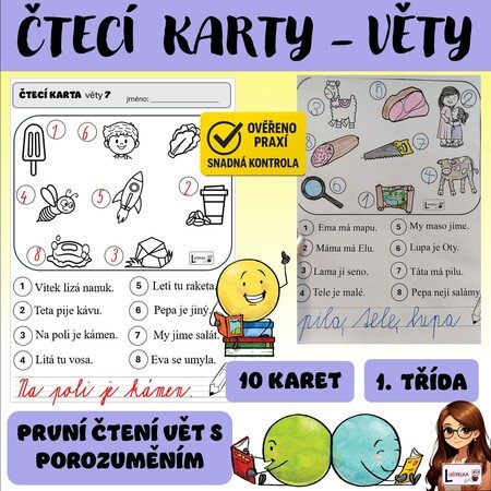 Žáci dostanou nebo si vyberou čtecí kartu. Děti mají za úkol přečíst první věty a dle významu a porozumění najít obrázek, ke kterému zapíší číslo u věty. Dalším úkolem je přepsat slova či větu, o které četli na spodní řádek. Možné využít i pro individuální práci.