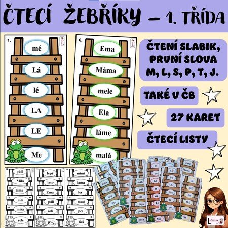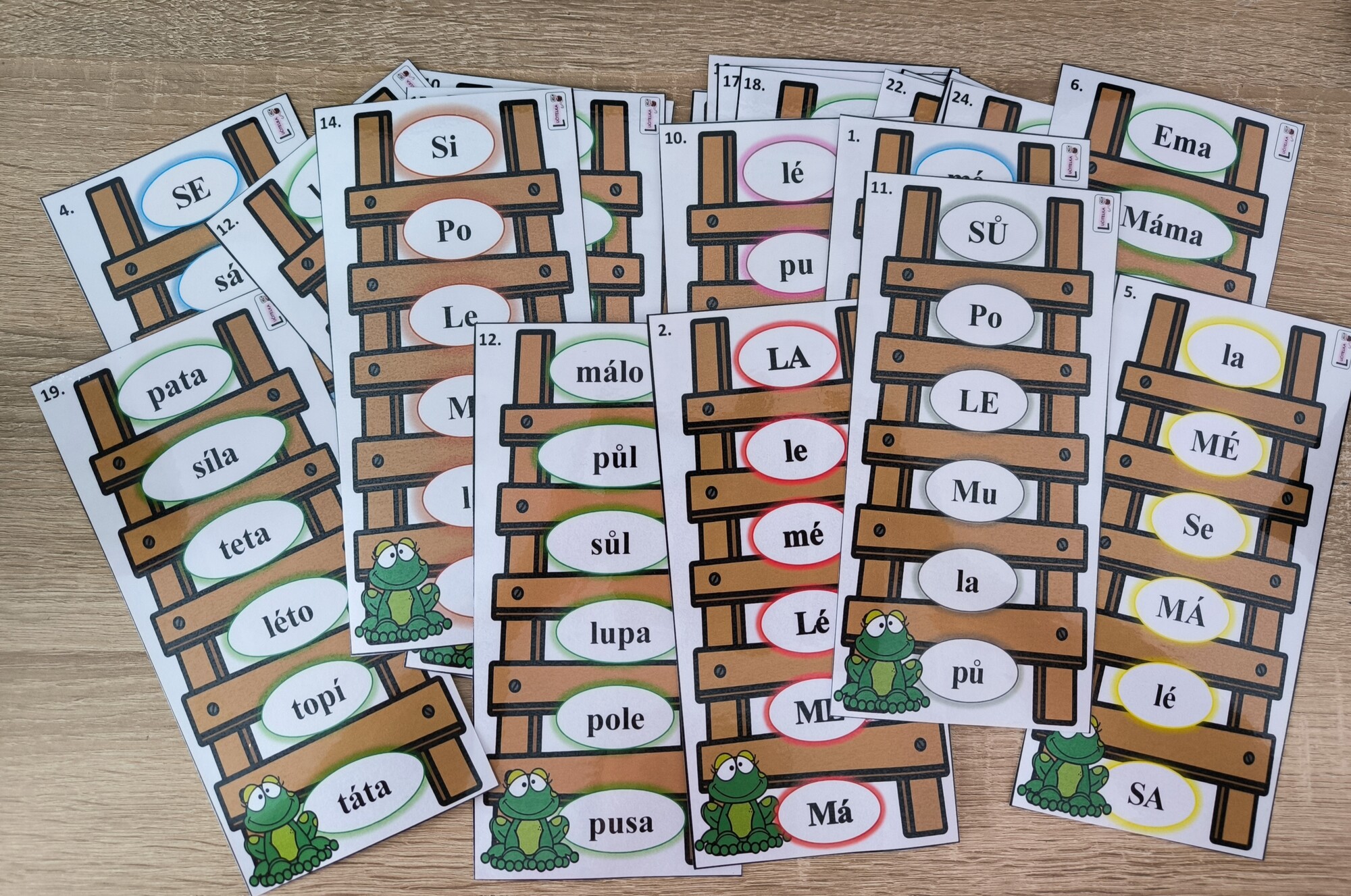 Cílem materiálu je procvičit si čtení prvních slabik a slov. V materiálu najdete 27 žebříků. Každý žebřík obsahuje 6 slabik, které jsou postupně tvořeny dle návaznosti písmen – M, A, L, E, S, O, P, U, T, J. Materiál lze využít k individuálnímu čtení nebo promítnout na tabuli a čteme společně. Slabiky jsou namíchané z různých velikostí písma. Není vhodné pro genetickou metodu čtení, spíše pro analyticko-syntetickou. V materiálu najdete i menší ČB kopie žebříků, které se dají využít i jako čtecí listy na domácí procvičování nebo jako kontrola při čtení pro učitele. Žáci čtou převážně od žáby, ale lze číst i odshora dolů. V materiálu najdete i první slova s otevřenými slabikami a žebřík číslo 27 obsahuje pouze slova s uzavřenou slabikou.