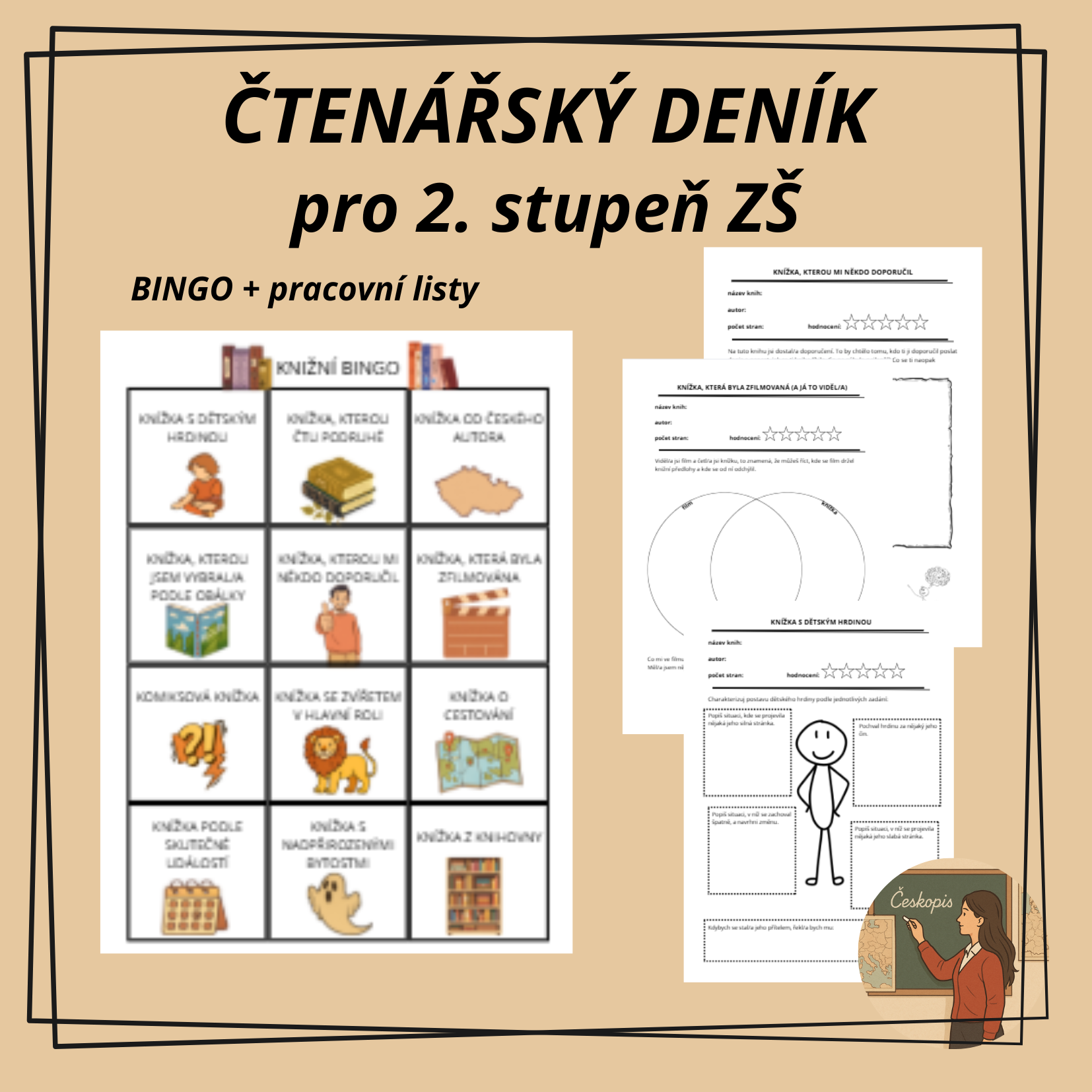 3) 14 originálních pracovních listů pro jednotlivá témata z binga (pracovní list s dětským hrdinou je ve variantě hrdina a hrdinka, pracovní list zfilmované knihy je ve variantě viděl/a film a neviděl/a film.)