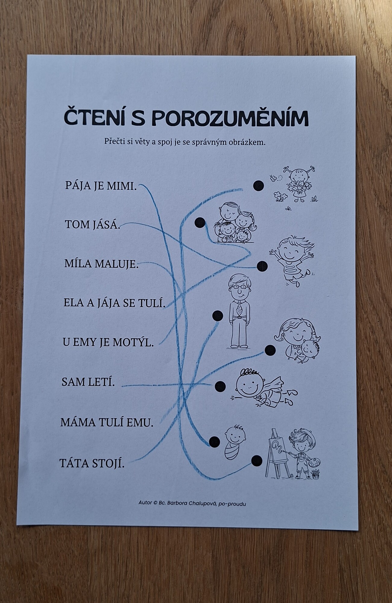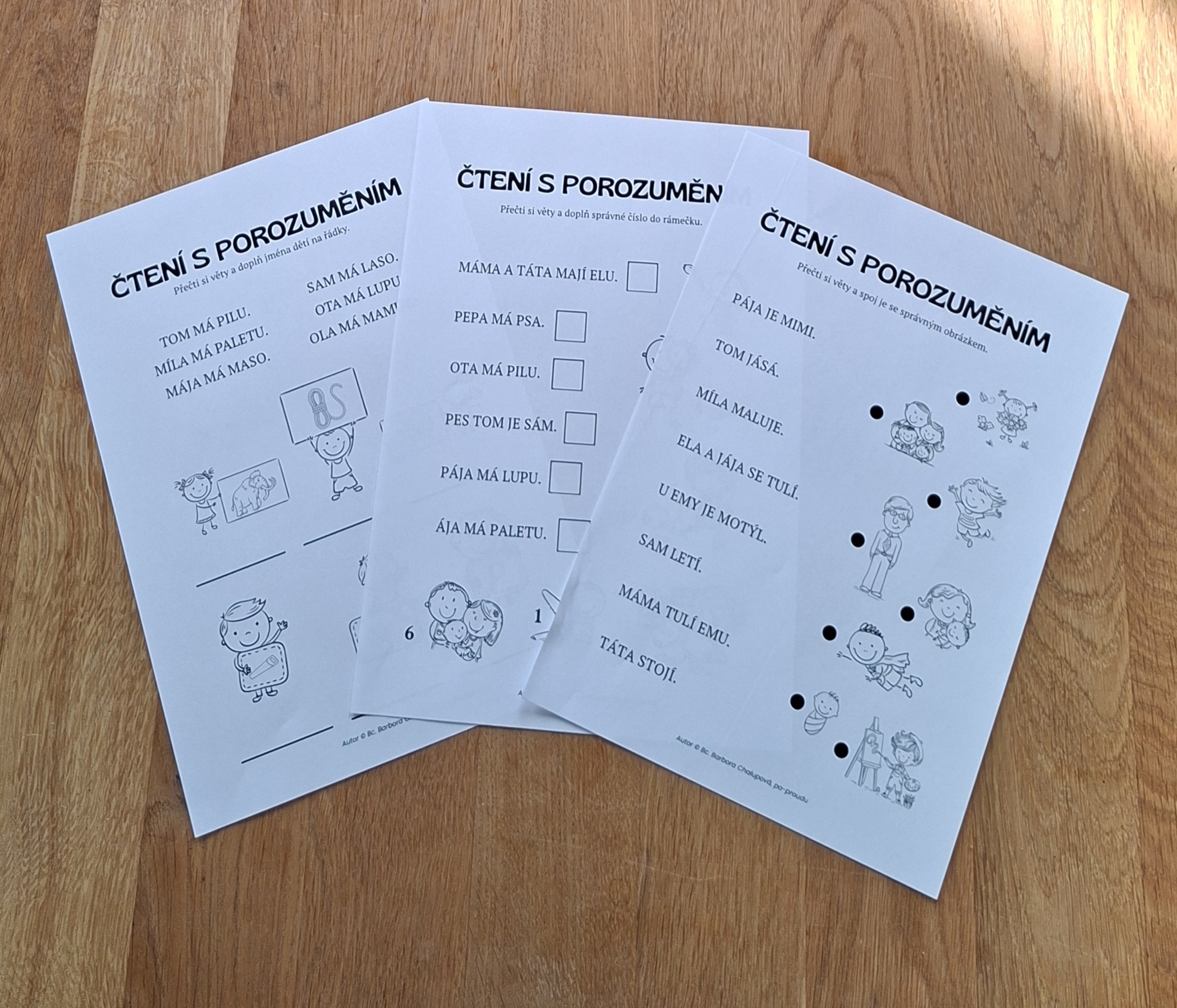- 4 různé typy úkolů zaměřených na porozumění krátkým větám a slovům.