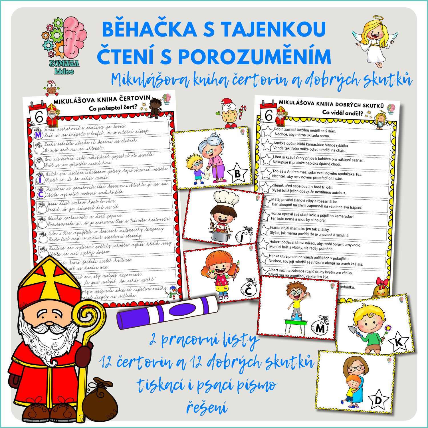 Hravá mikulášská běhačka plná lumpáren a dobrých skutků. Děti čtou věty, hledají odpovídající obrázky, odkrývají tajenku a nenápadně procvičují čtení s porozuměním.