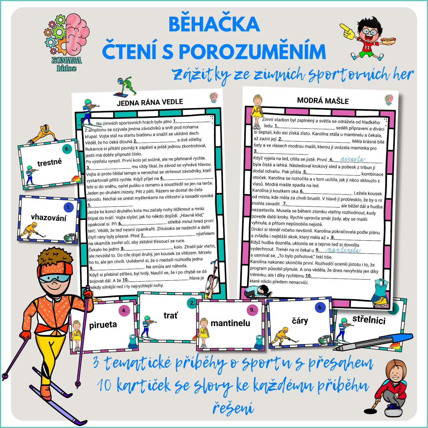 Běhačka na téma zimních sportovních her! Tři poutavé příběhy z prostředí biatlonu, krasobruslení a ledního hokeje očima sportovců. Doplňování slov, práce s kontextem a aktivní pohyb po třídě pro žáky 2.–3. třídy.