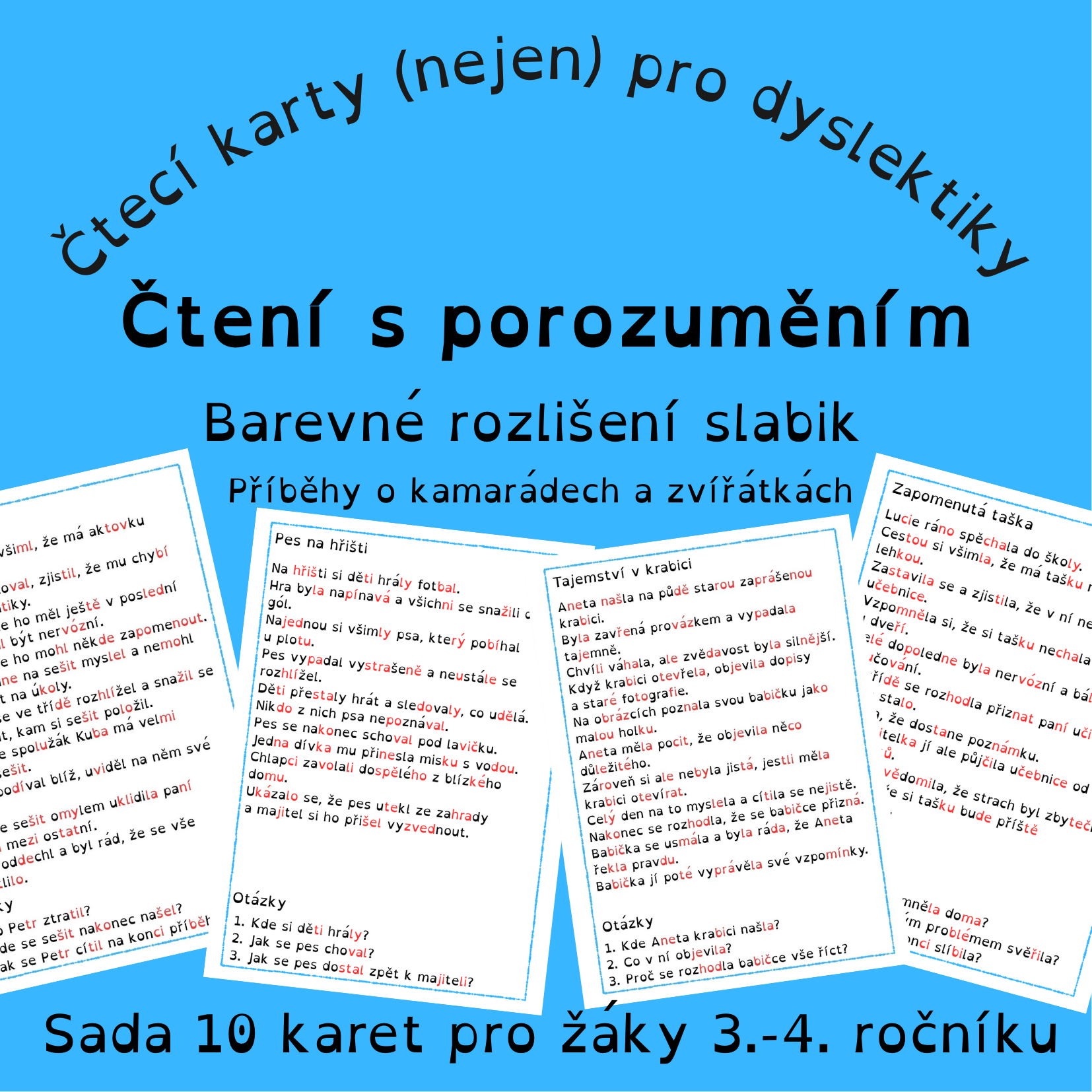Materiál obsahuje 10 čtecích karet formátu A5 s příběhy z prostředí dětí i zvířat pro 3.–4. ročník ZŠ. Texty jsou psány vypravěčským stylem v minulém čase, jsou barevně rozděleny po slabikách a zpracovány písmem OpenDyslexic. Materiál je vhodný i pro dyslektiky.