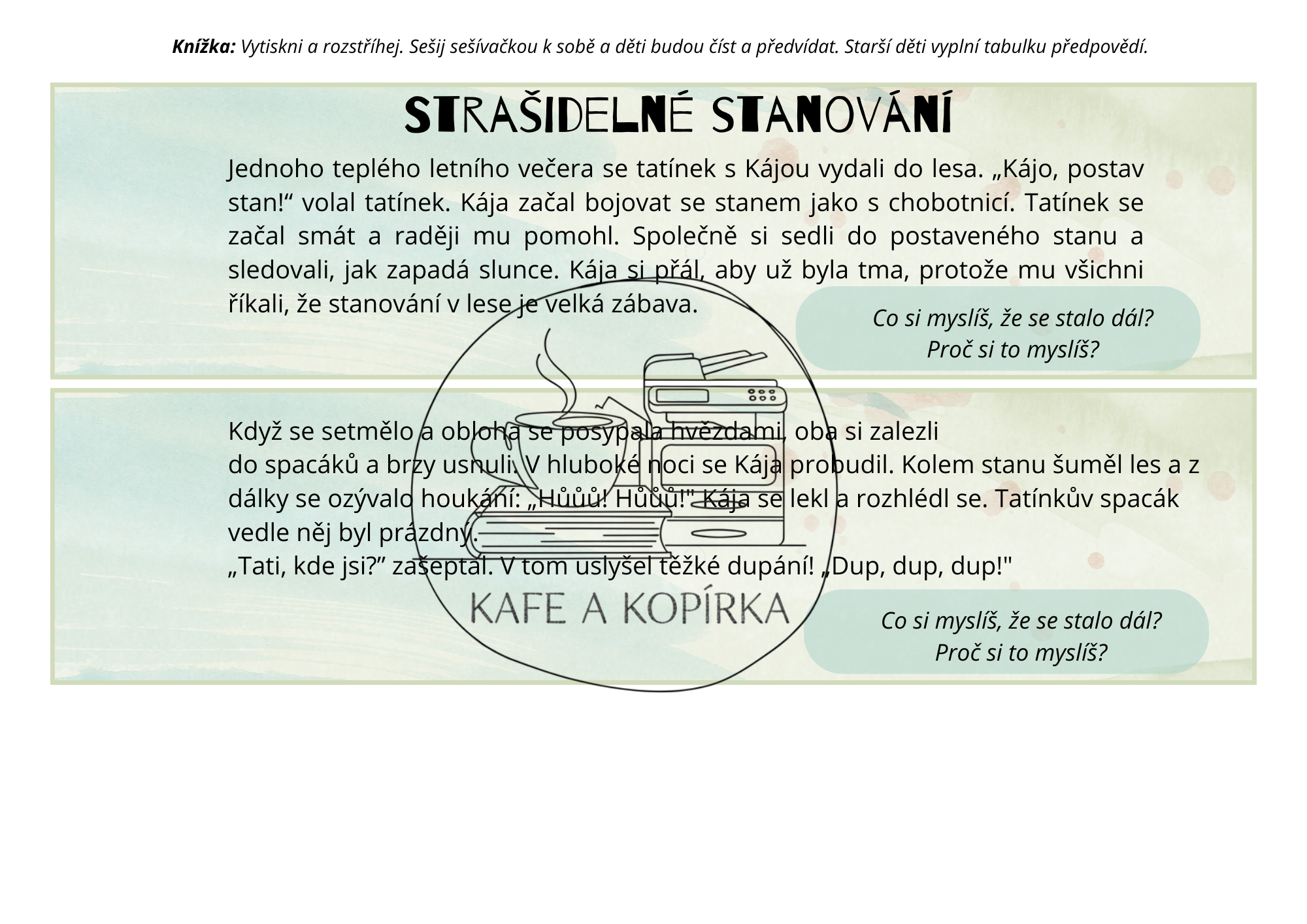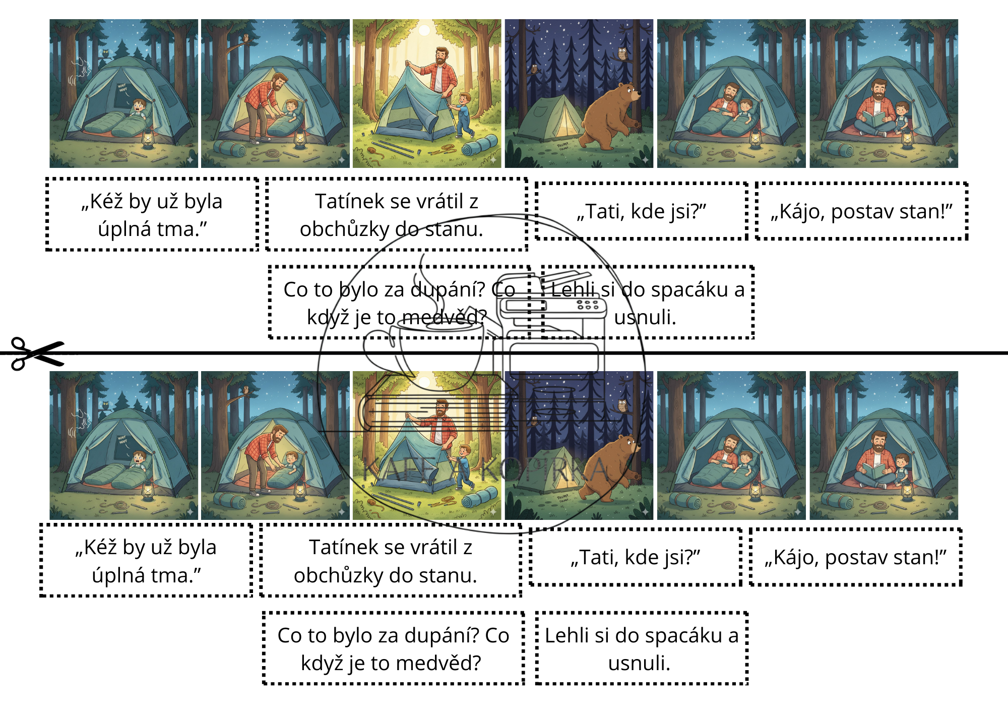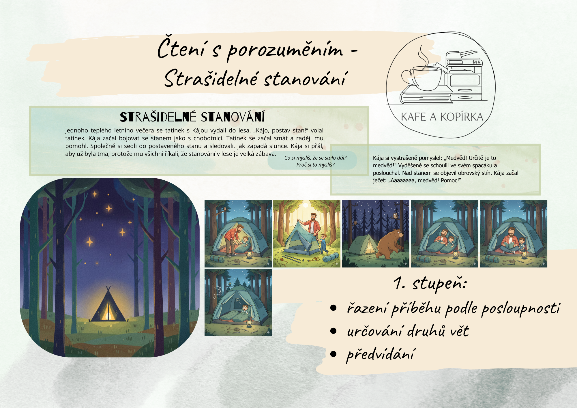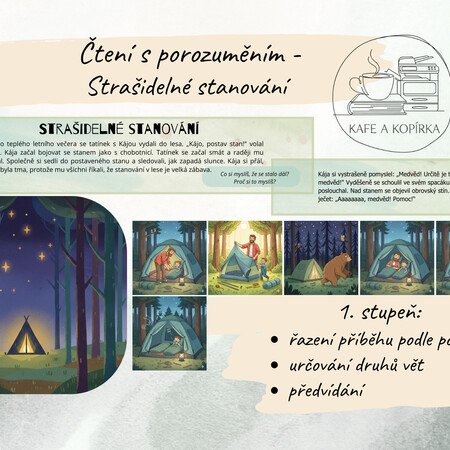 Materiál je určen pro žáky 1. stupně ZŠ. Slouží k rozvoji dovedností čtení s porozuměním - příběh "Strašidelné stanování".
