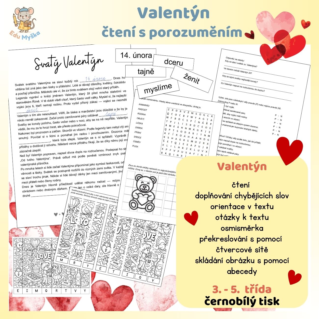 - Text o svatém Valentýnu (o svátku i legenda o mnichovi). V textu chybí 5 slov. Chybějící slova může vyučující rozmístit po třídě, žáci je hledají a pak podle smyslu dopisují do vět. Žáci mohou text dostat rozstříhaný po odstavcích a jejich úkolem je text správně seřadit a nalepit na papír ve správném pořadí.