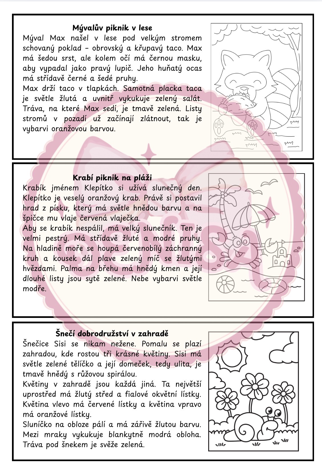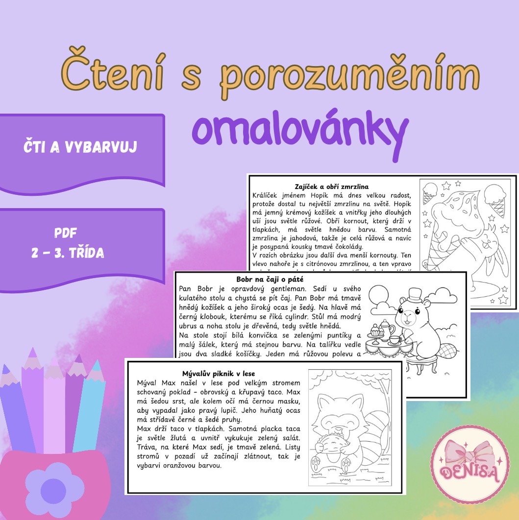 Hledáte zábavný způsob, jak u dětí procvičit čtení s porozuměním? Tento soubor pracovních listů je navržen pro žáky 2. a 3. třídy základní školy. Kombinuje krátké příběhy s vybarvováním, které děti motivuje k pozornému čtení. Aby byl obrázek správně vybarvený, musí dítě v textu vyhledat konkrétní informace o barvách a detailech.