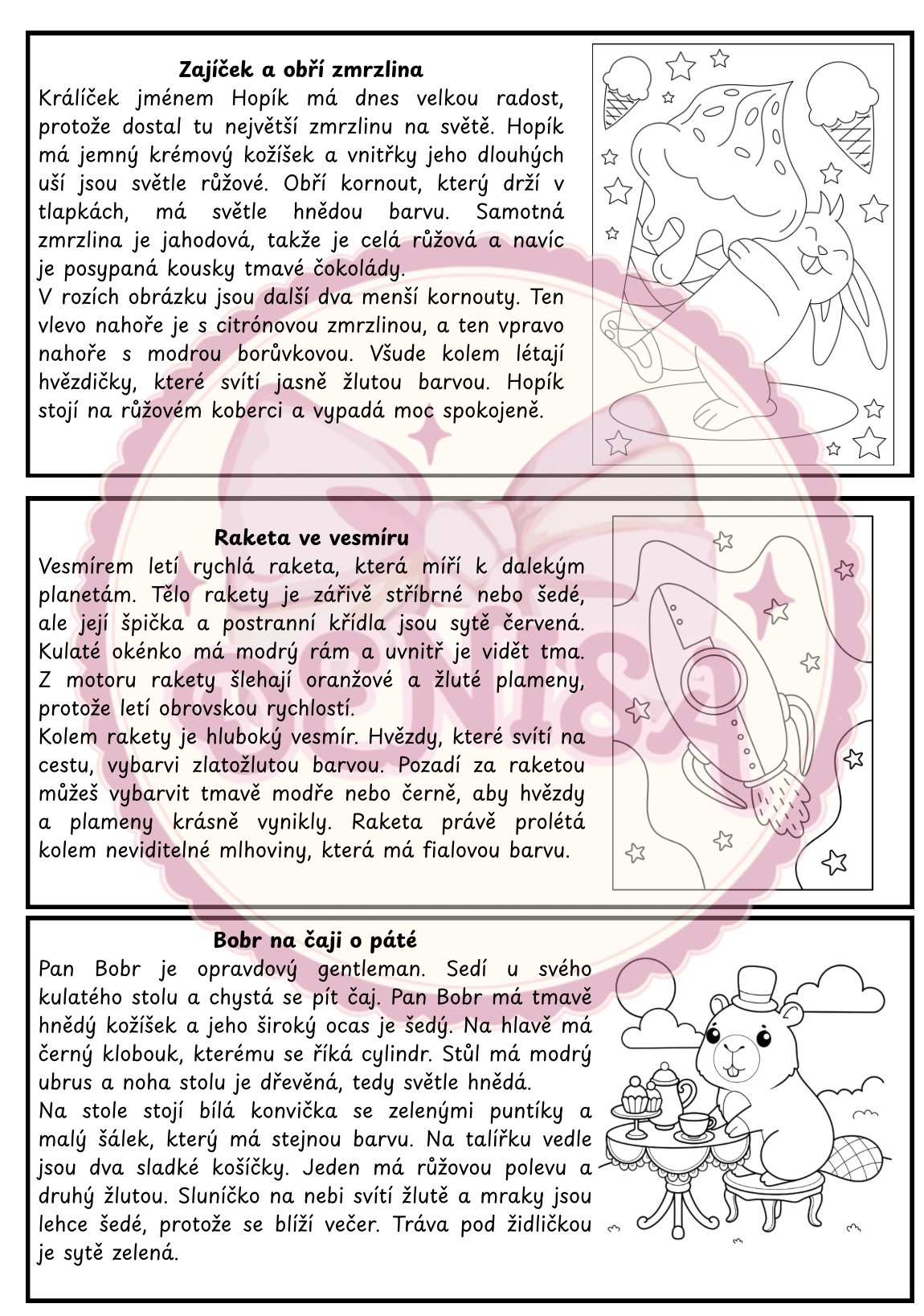 Soubor obsahuje celkem 6 textů s omalovánkou. Děti se setkají se zajíčkem Hopíkem a jeho obří zmrzlinou, poletí raketou do vesmíru nebo navštíví pana Bobra u čaje o páté. Čeká je také lesní piknik s mývalem Maxem, letní den na pláži s krabem Klepítkem a zahrada plná květin se šnečicí Sisi.