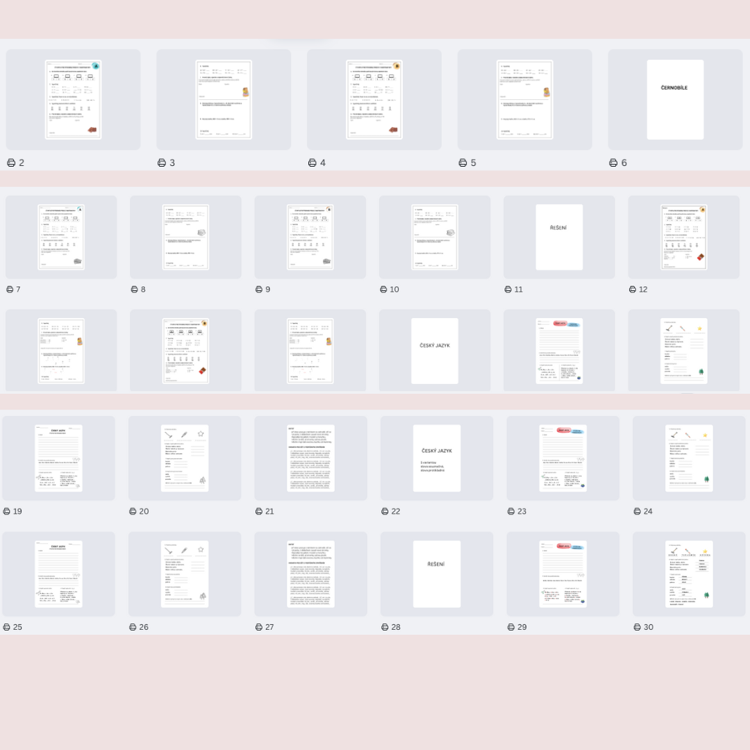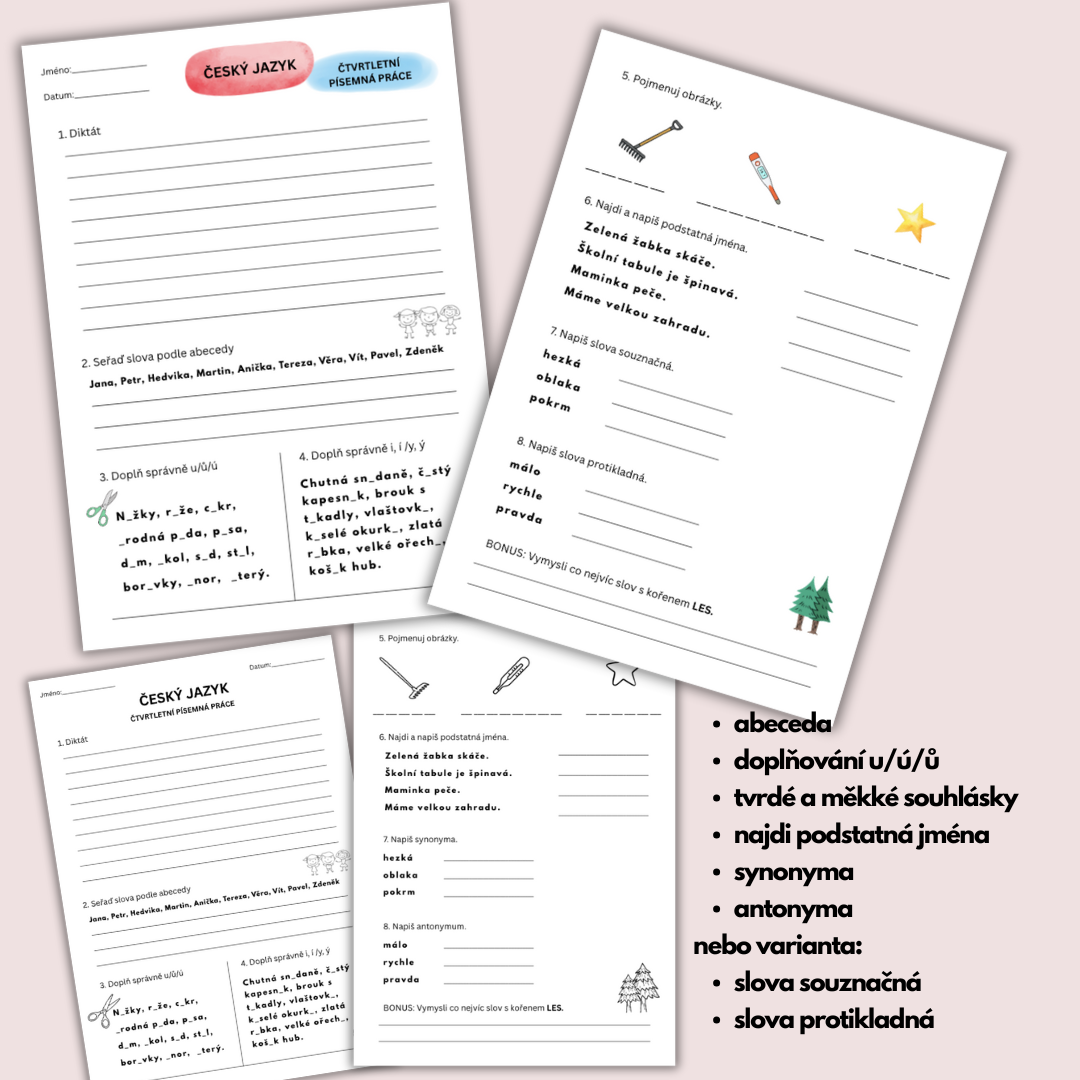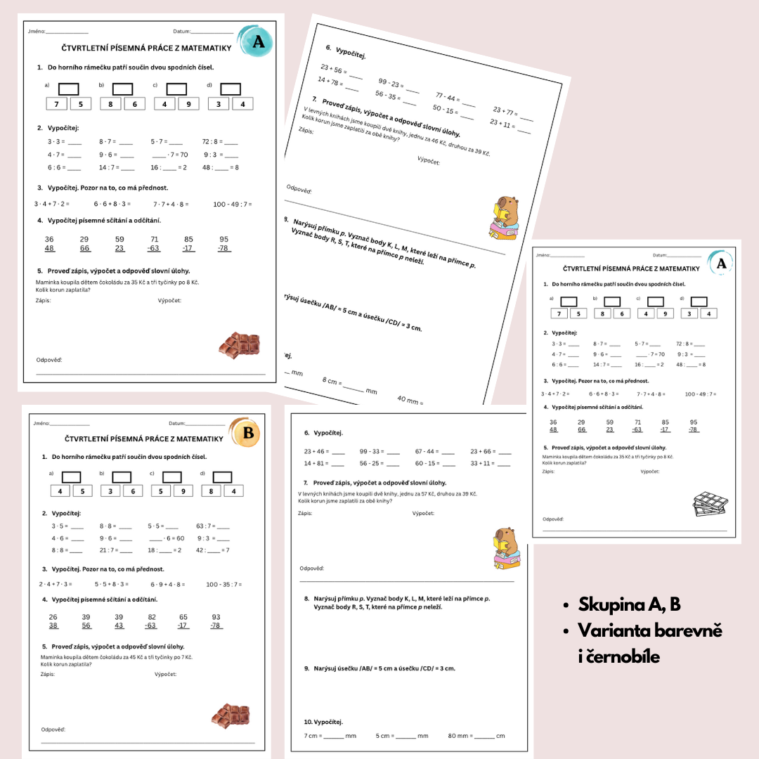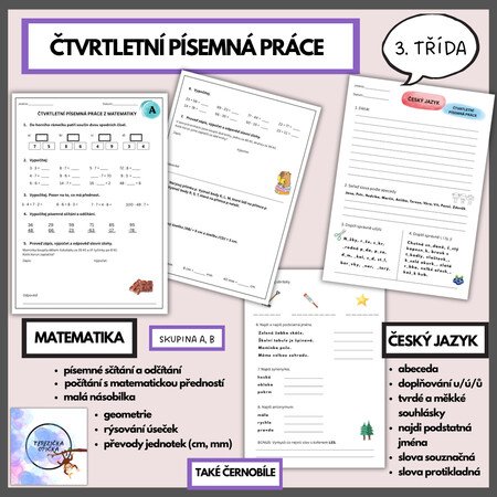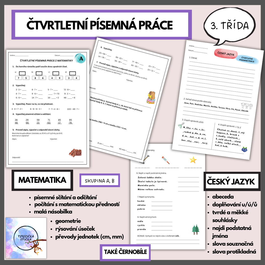 Písemná práce je vždy na dvě strany v černobílé variantě i barevném provedení. Matematický soubor obsahuje 2 varianty (označeno A, B). Český jazyk je pouze jedna varianta. Materiál obsahuje řešení a slouží k ověření znalostí z 1. čtvrtletí z matematiky i českého jazyka.