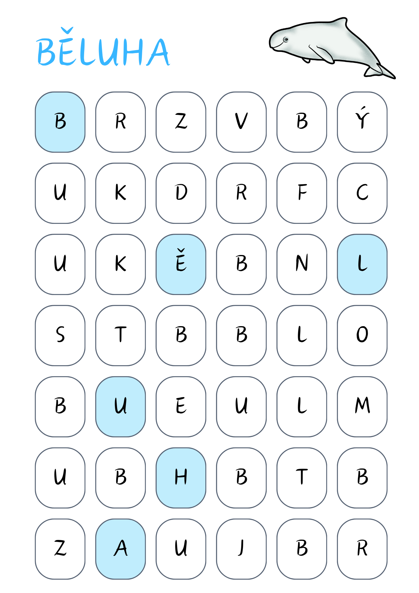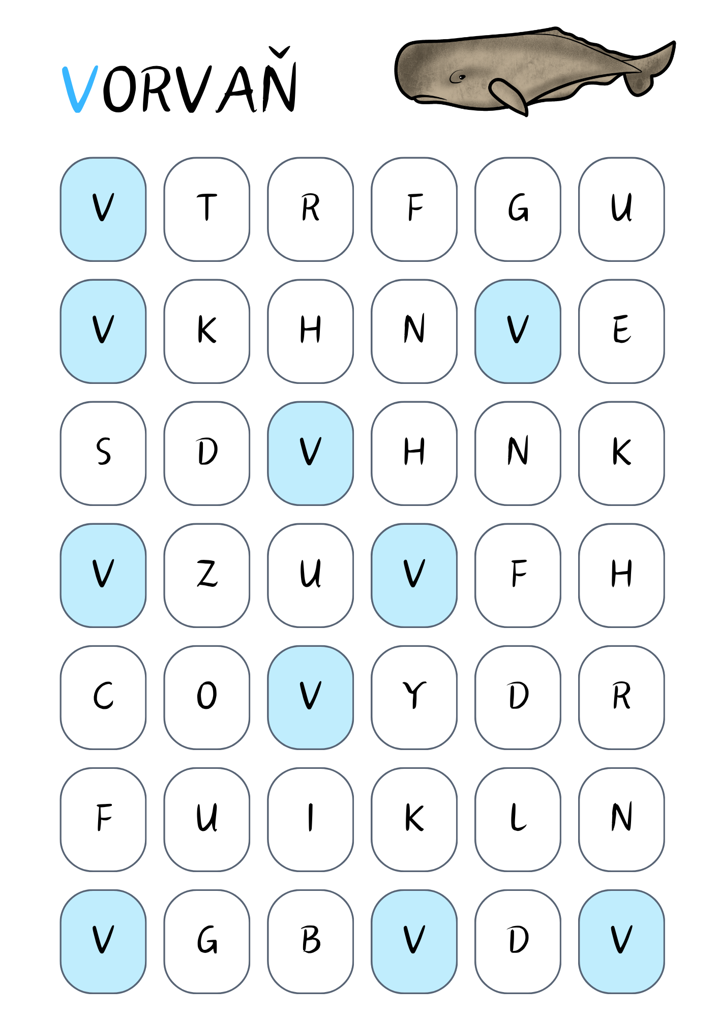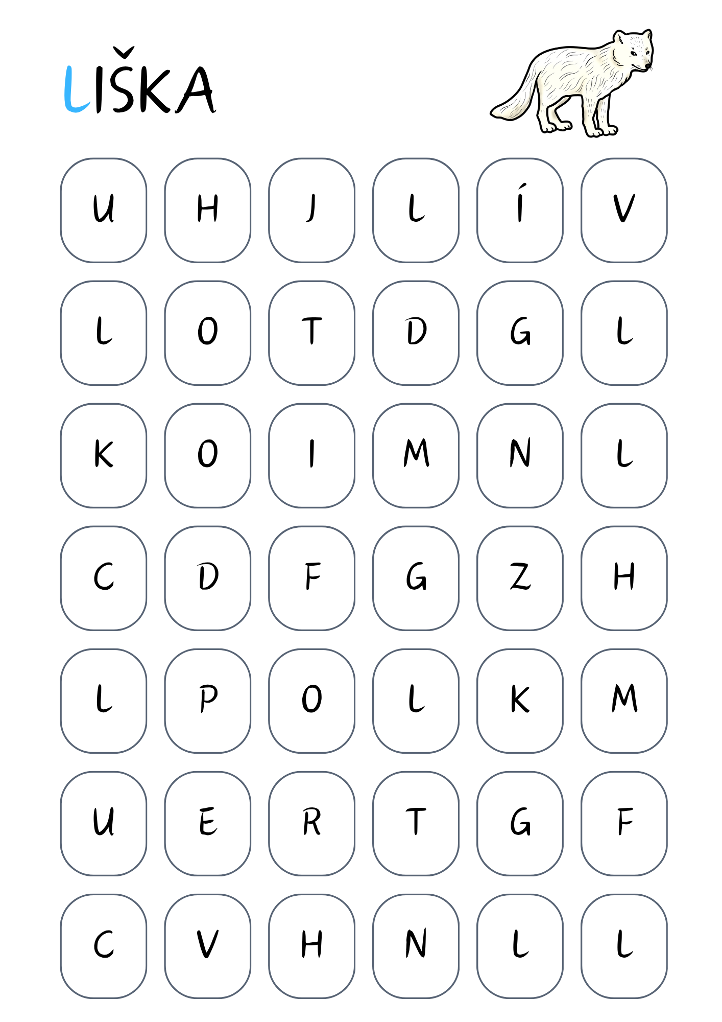 Děti skládají a přepisují slova, určují první a poslední písmeno, slabikují a vyhledávají písmena i celá slova v mřížce.