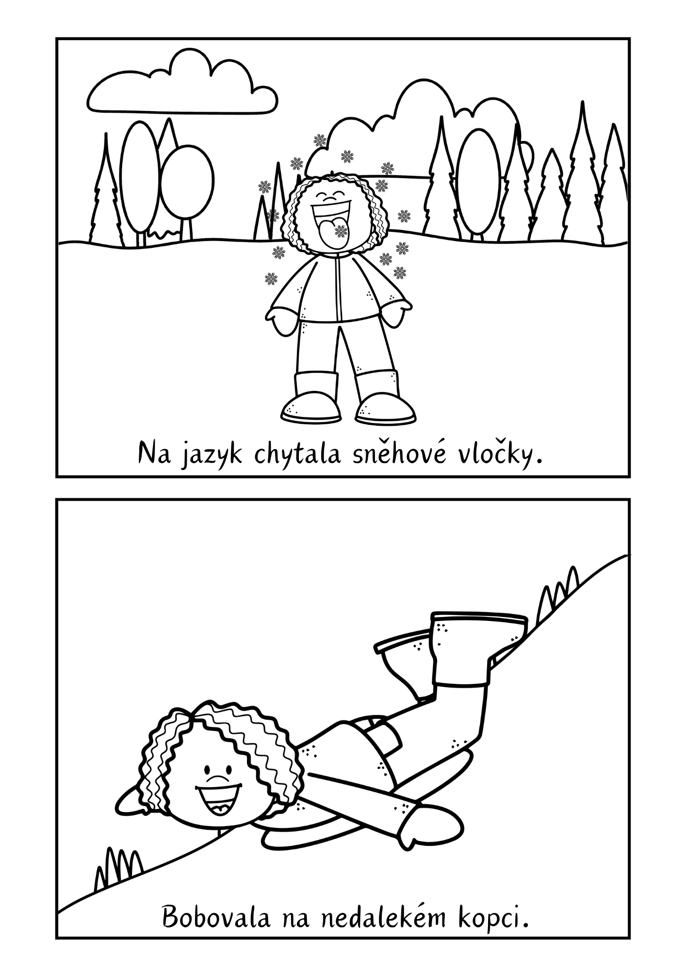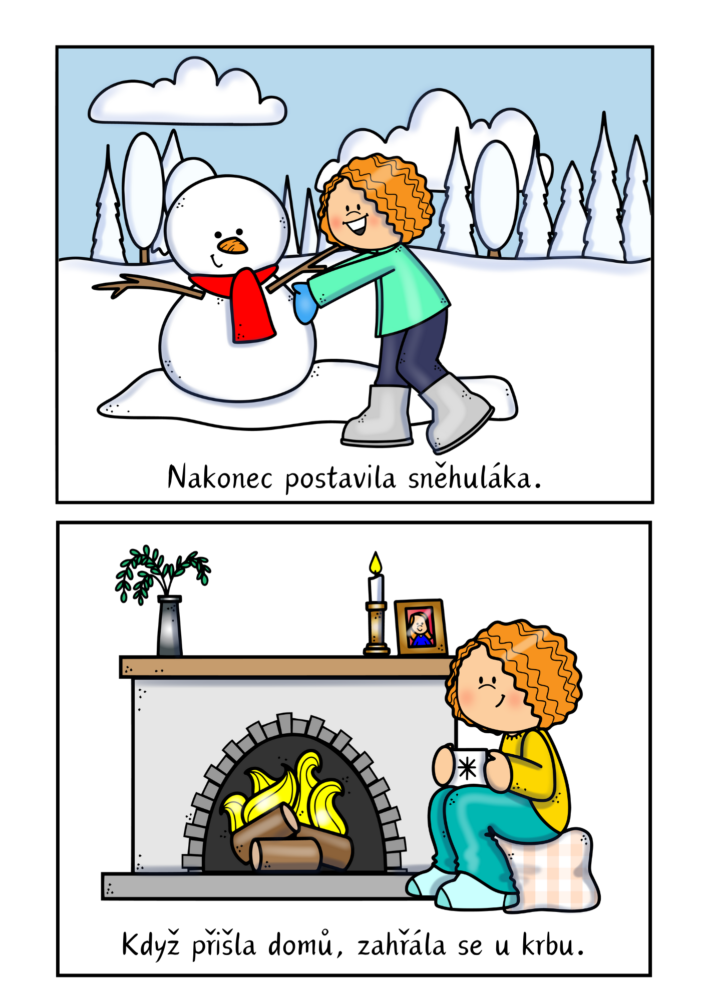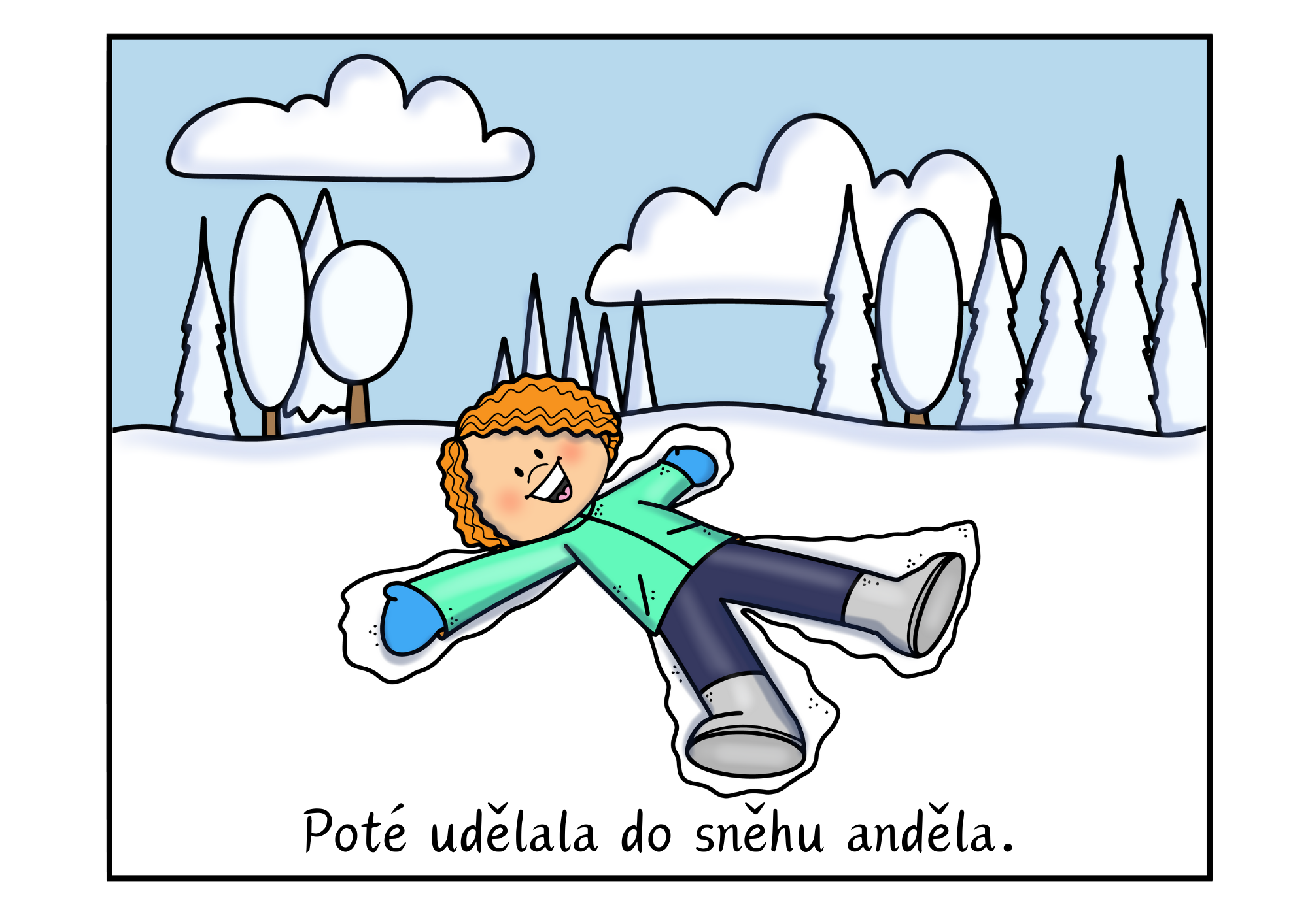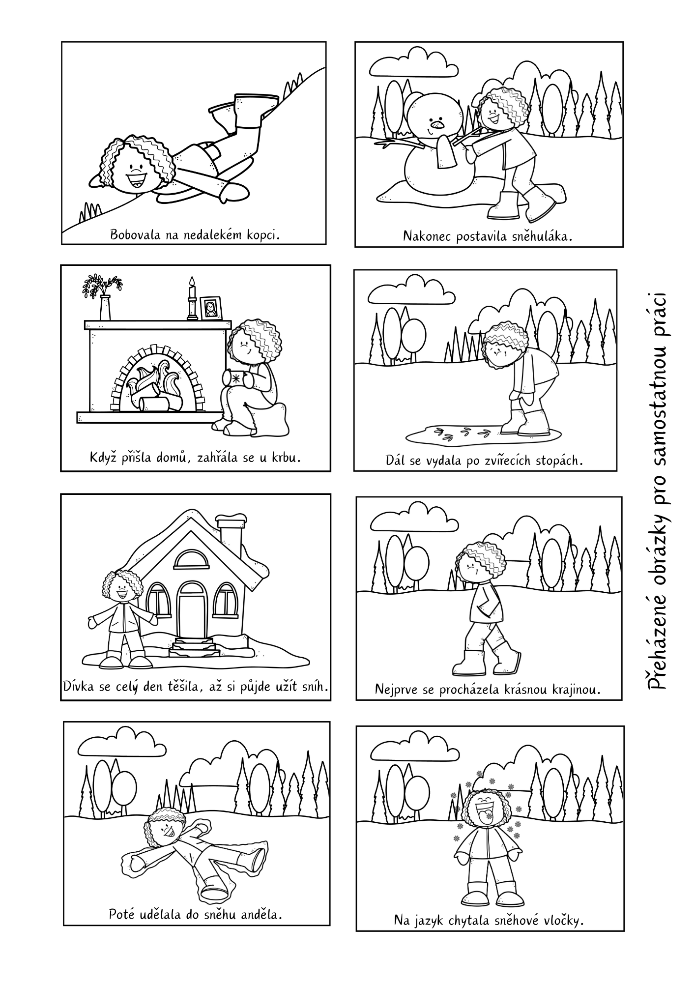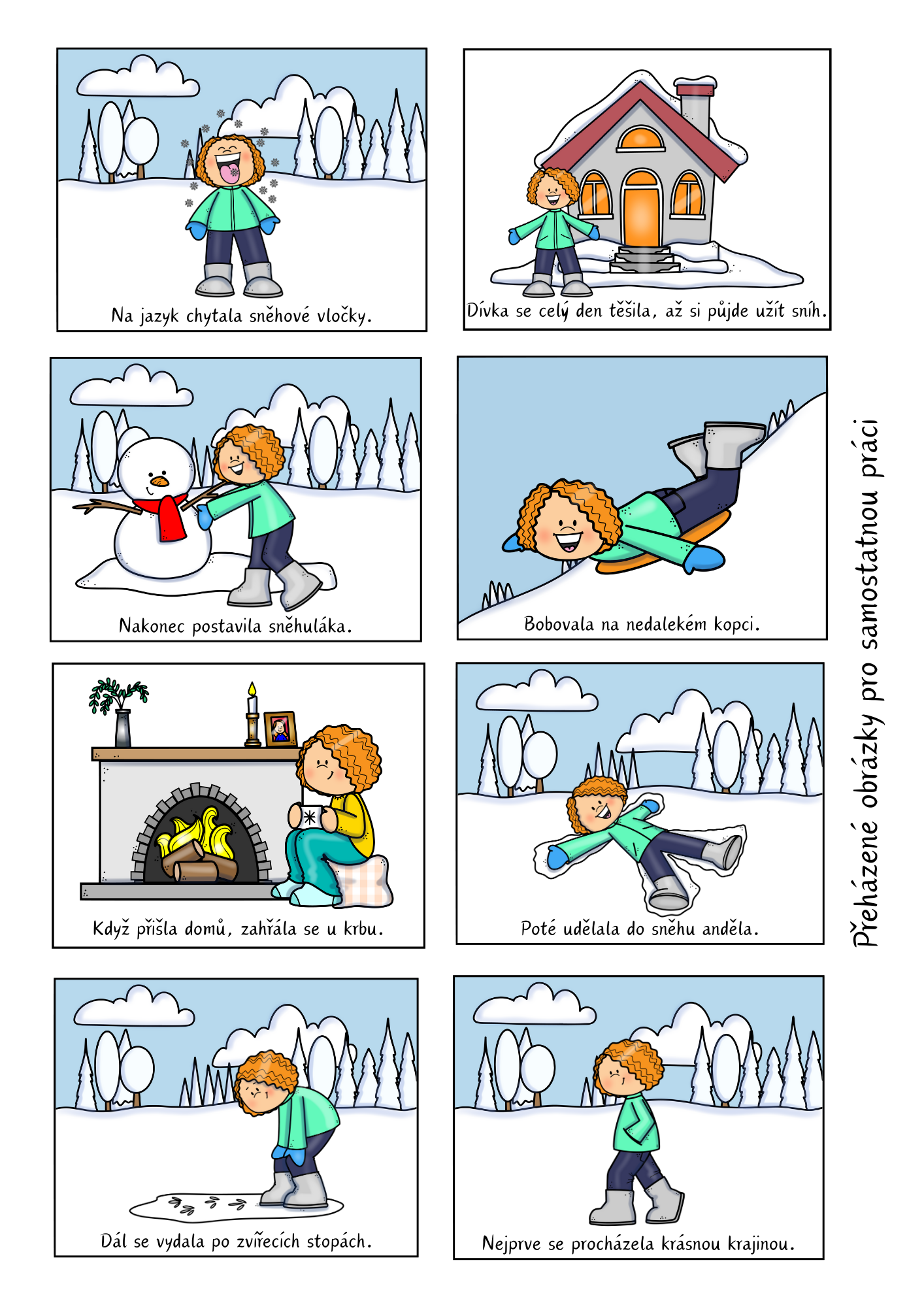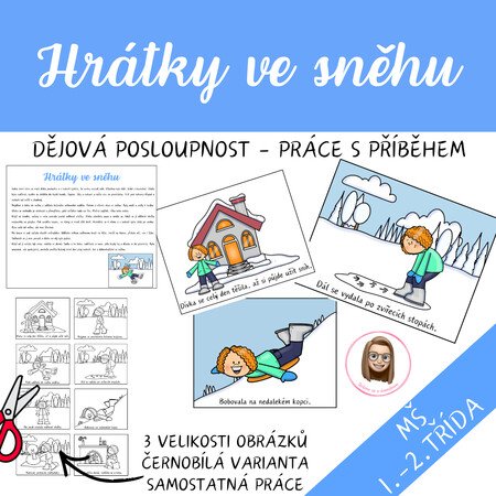 Materiál pomáhá dětem procvičit dějovou posloupnost pomocí zimního příběhu o hrátkách ve sněhu. Děti řadí 8 obrázků, vyprávějí děj, rozvíjejí porozumění textu, slovní zásobu i spolupráci.
