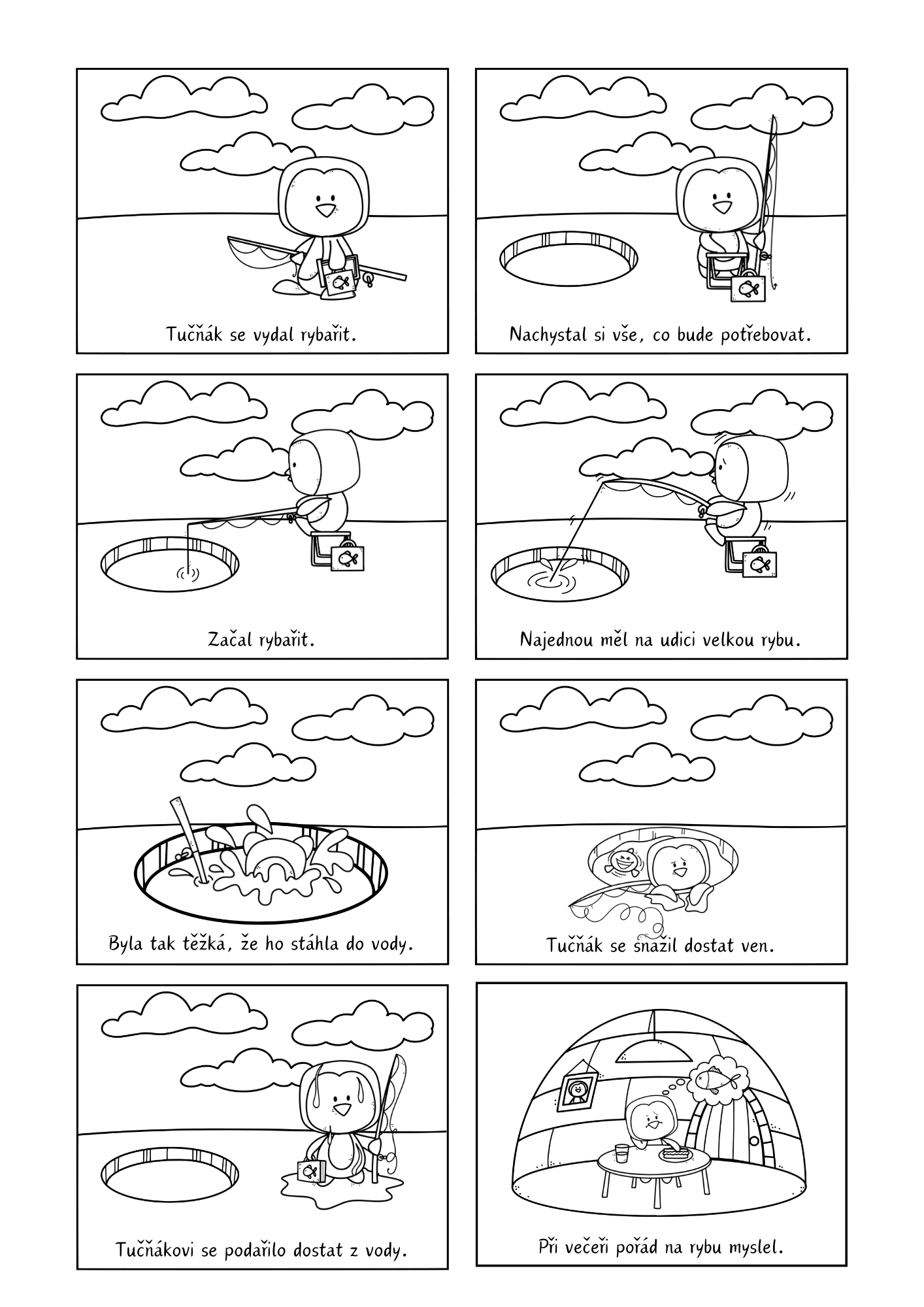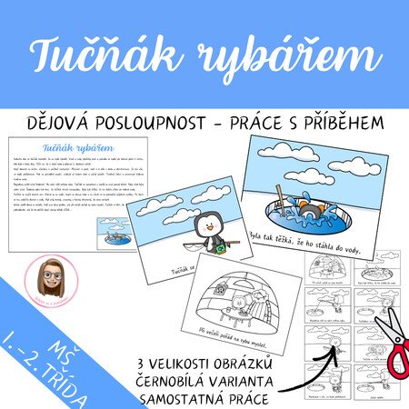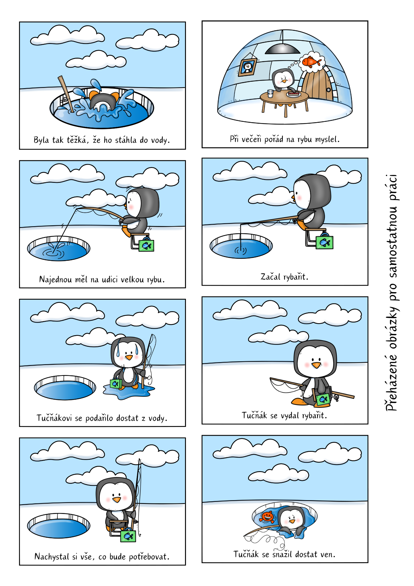 Soubor je zaměřen na rozvoj dějové posloupnosti, porozumění textu a vyjadřovacích schopností prostřednictvím krátkého příběhu o tučňákovi, který se vydal rybařit, aby si obstaral večeři. Děti sledují jednotlivé kroky příběhu, řadí 8 dějových obrázků podle správného pořadí a následně příběh převyprávějí vlastními slovy.