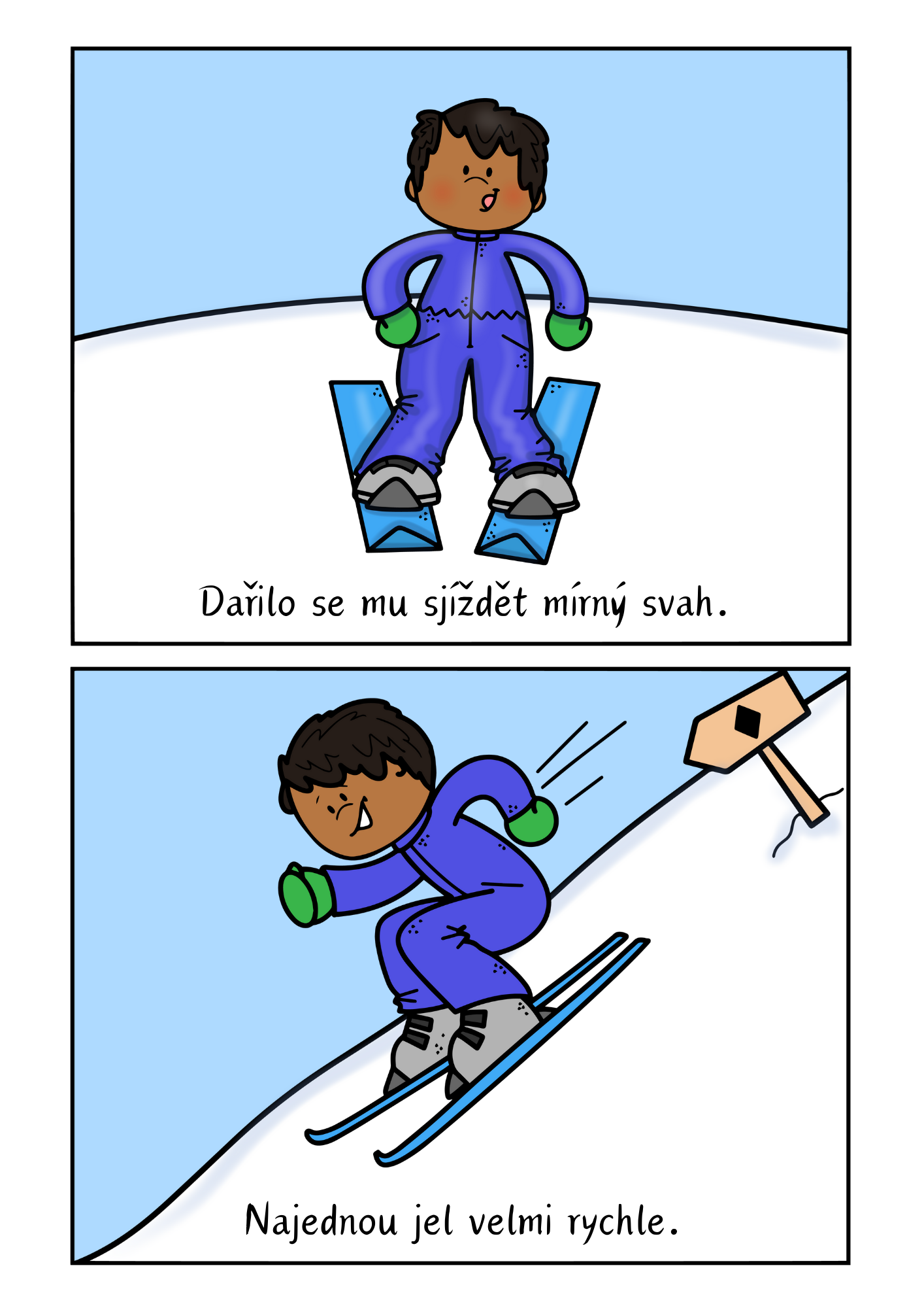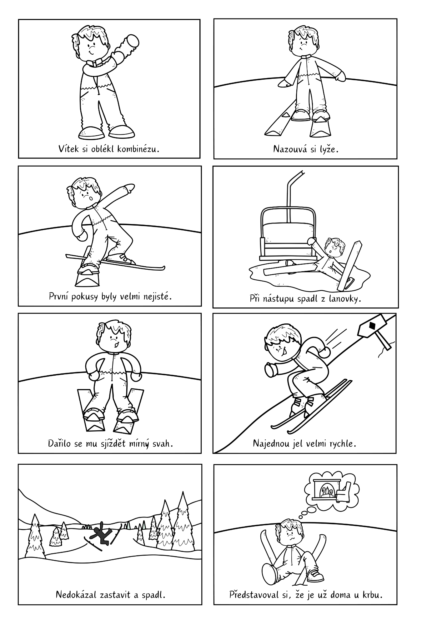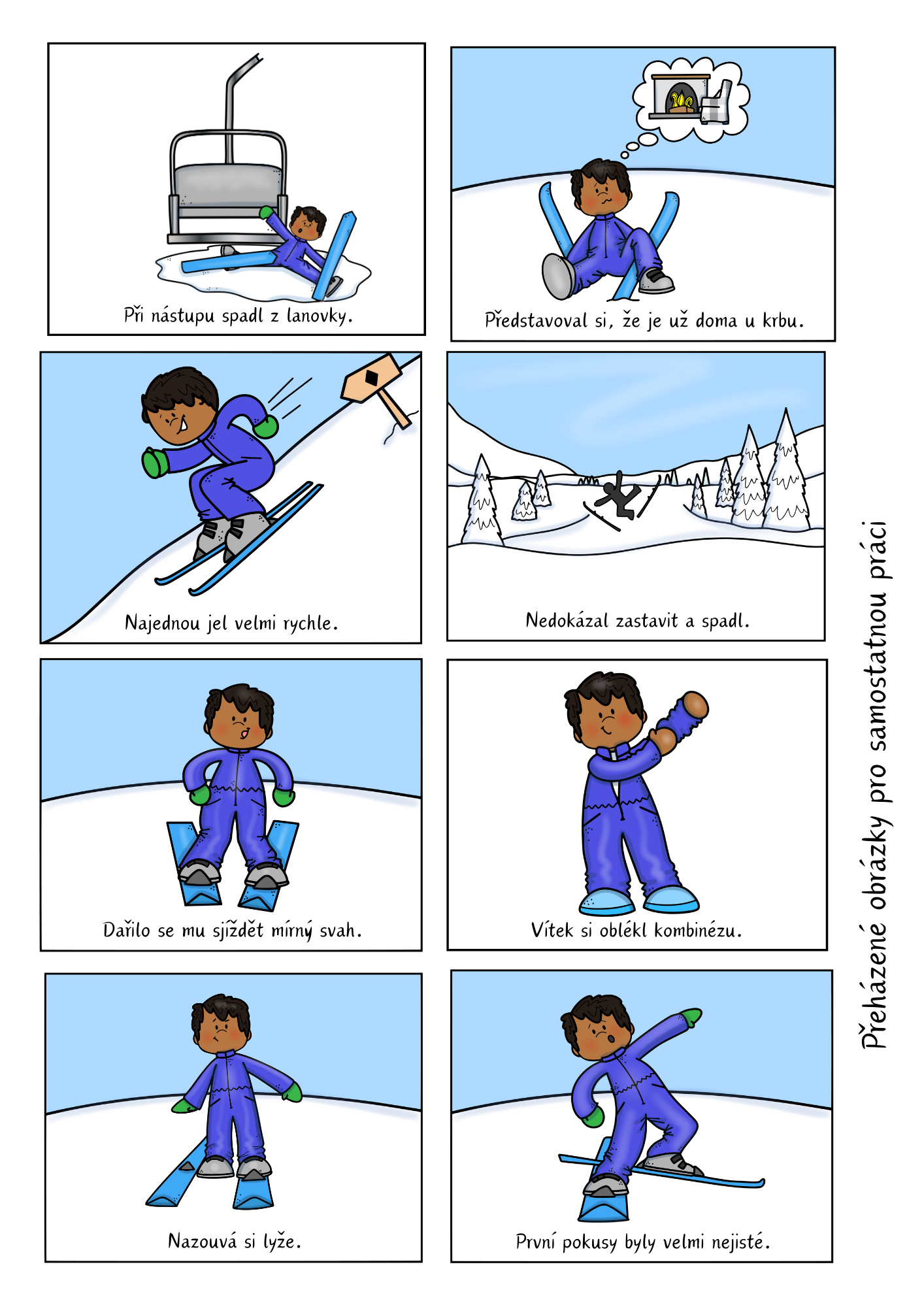 Dějová posloupnost s příběhem o Vítkovi, který se učí lyžovat. Soubor obsahuje 8 obrázků, příběh a otázky k zamyšlení