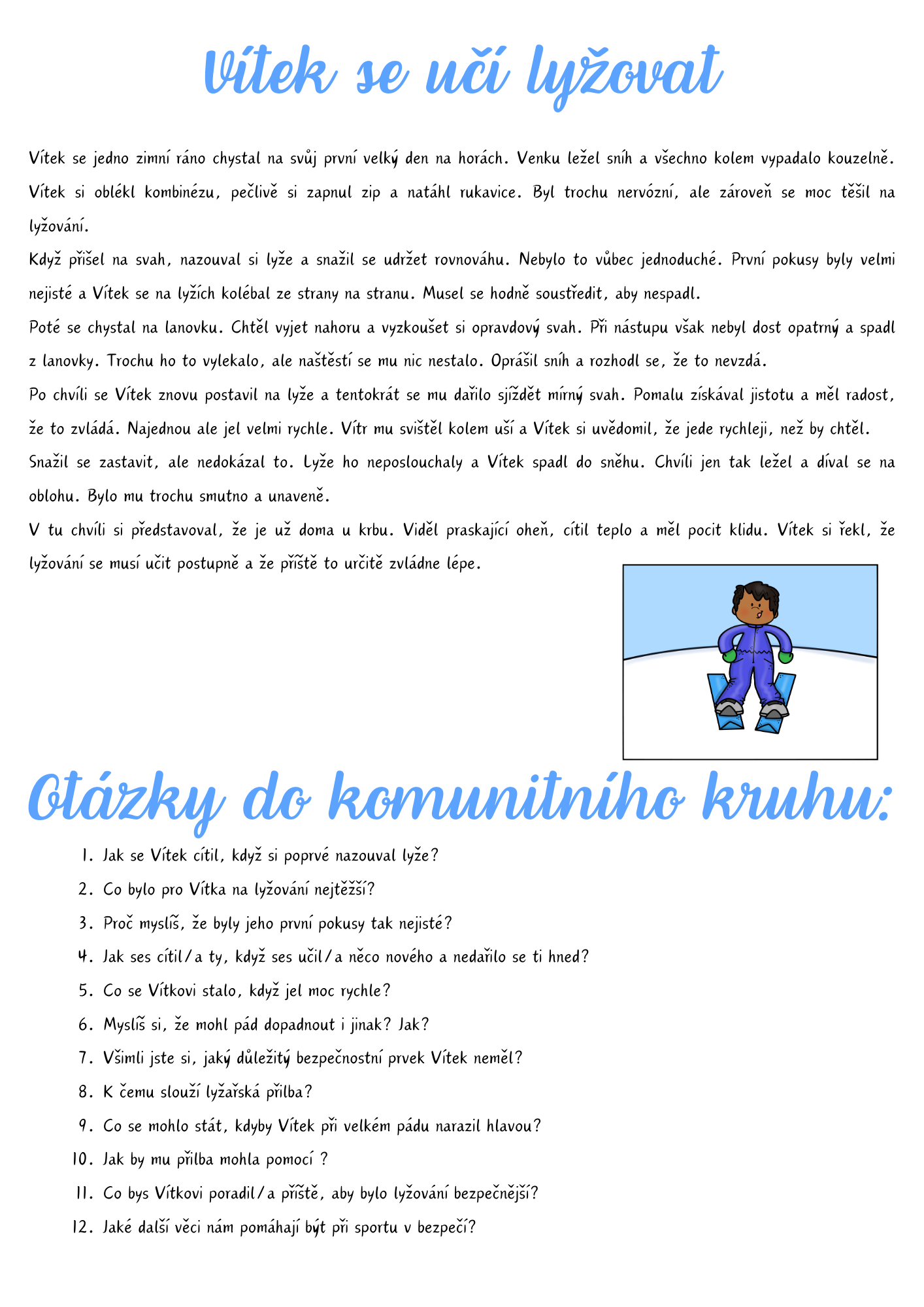 Soubor je zaměřen na rozvoj porozumění textu a dějové posloupnosti prostřednictvím zimního příběhu o chlapci jménem Vítek, který se učí lyžovat. Děti sledují jednotlivé situace příběhu, skládají je do správného pořadí a společně přemýšlejí nad ponaučením i bezpečností při sportu.