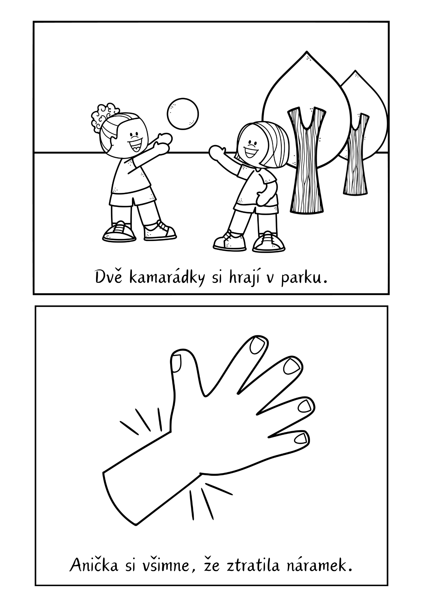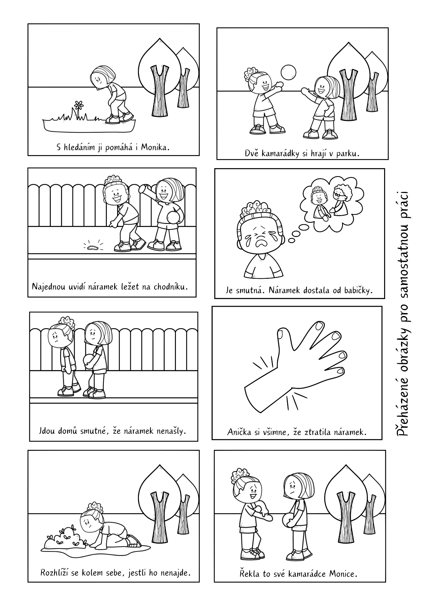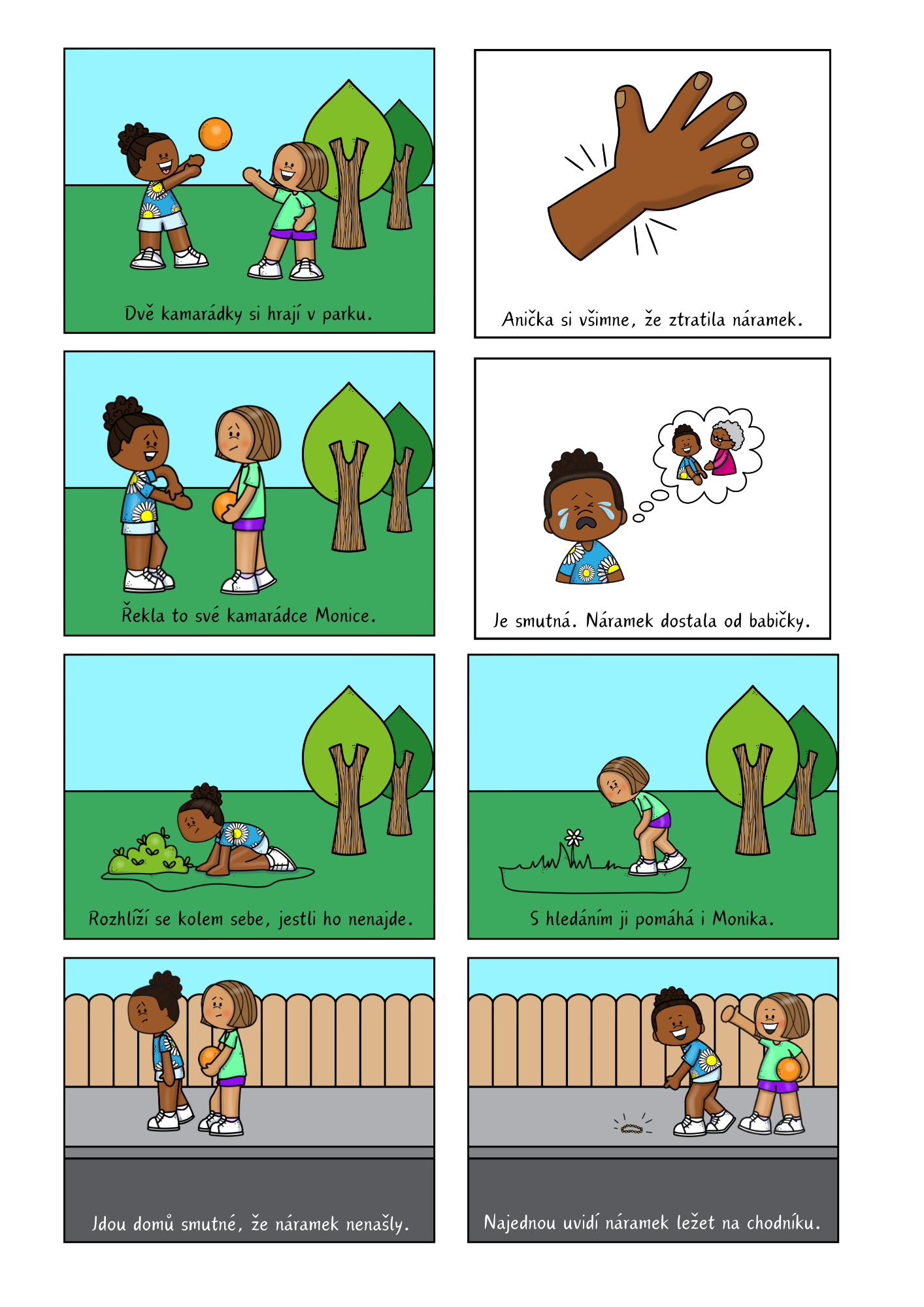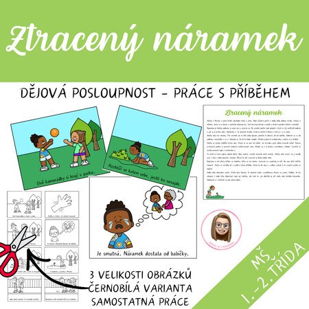 Děti prostřednictvím příběhu o ztraceném náramku sledují dobrodružství dvou kamarádek v parku a učí se chápat dějovou posloupnost, emoce a význam pomoci a kamarádství.