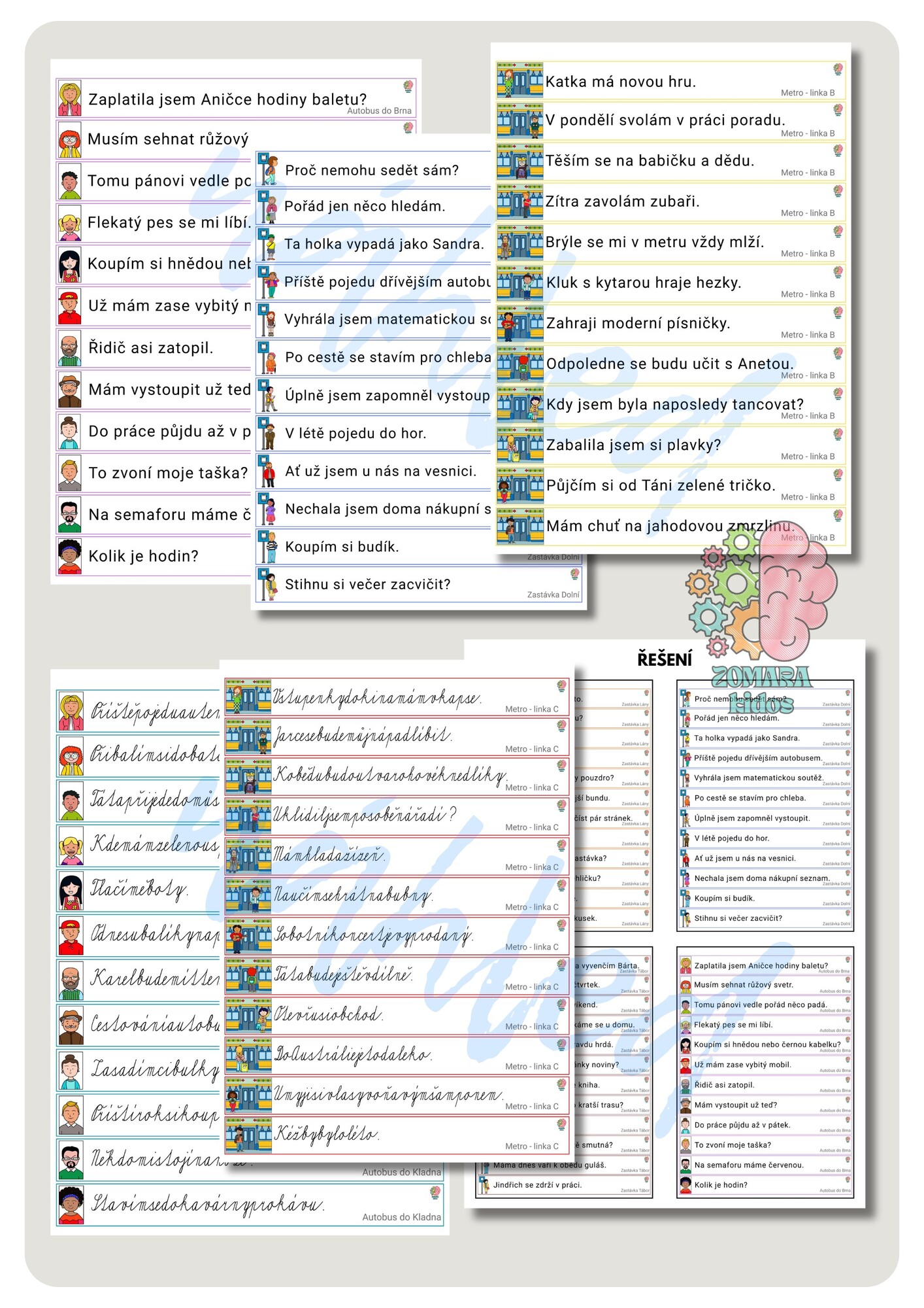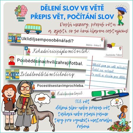 - 108 vět z prostředí autobusů, vlaků a metra – žáci doplňují mezery mezi slovy a přepisují věty správně.