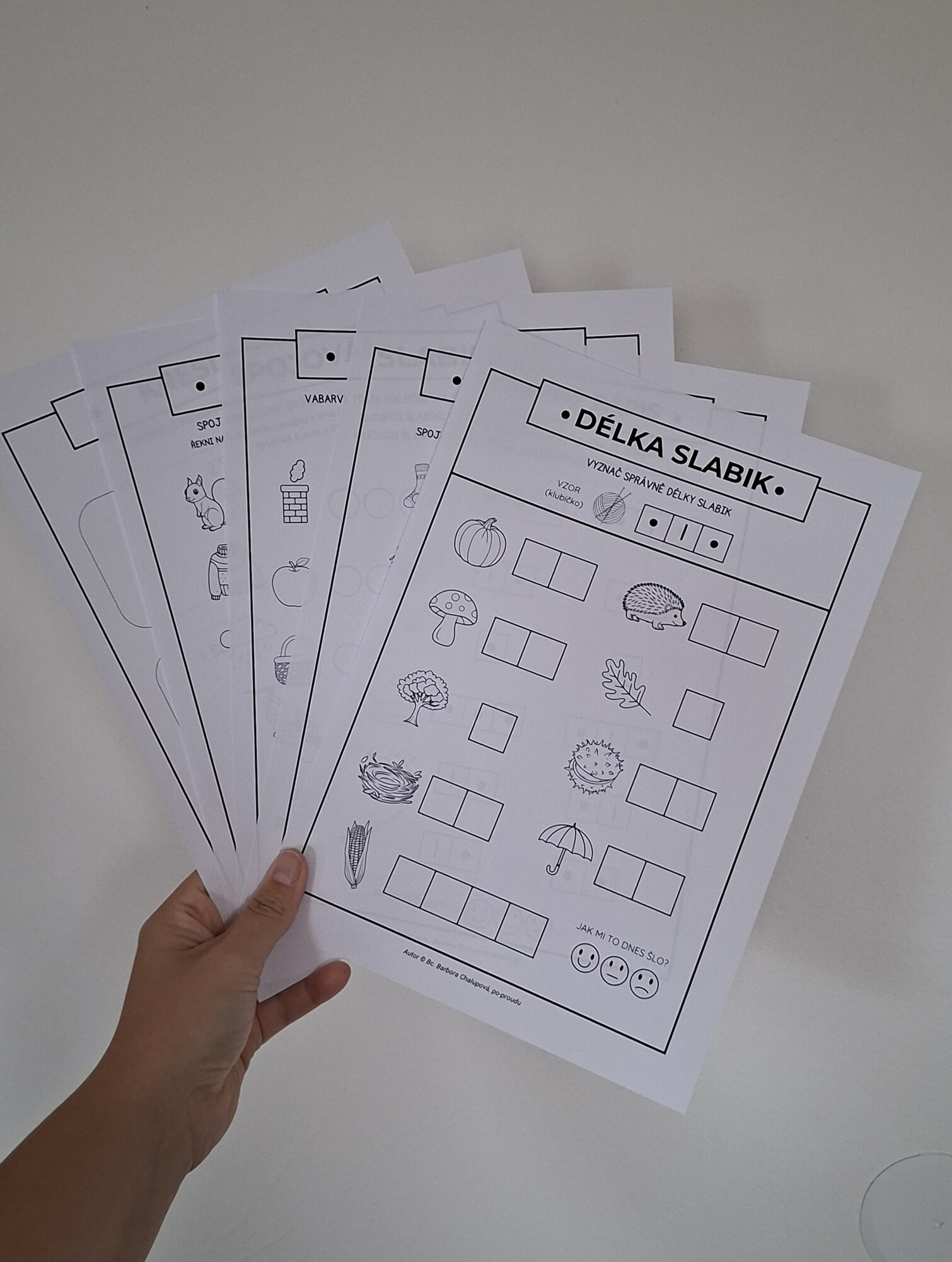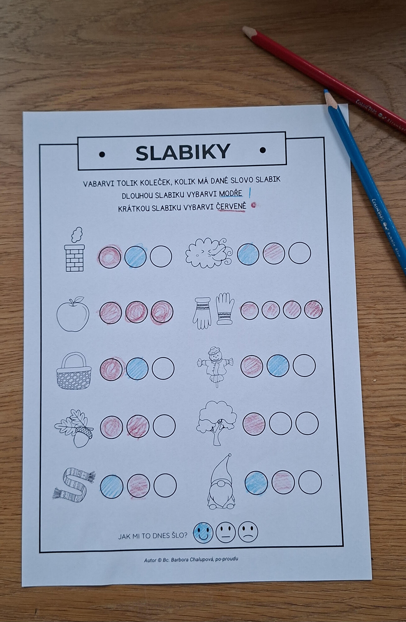 - Pracovní list 1 – Slabiky: děti vybarvují krátké a dlouhé slabiky různými barvami.