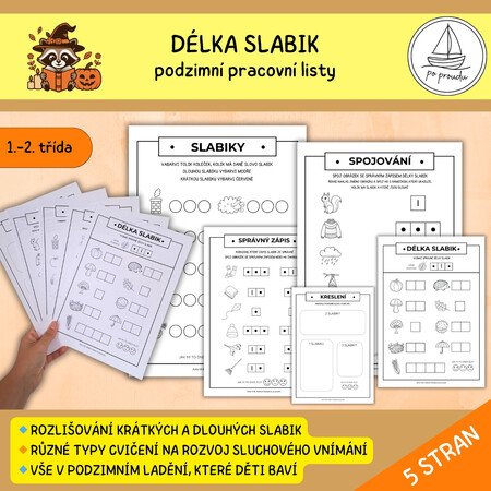 Děti spojují obrázky se zápisy, vybarvují, porovnávají a tvoří vlastní slova. Vše je laděno do podzimní atmosféry, která podporuje zájem o práci a rozvíjí jazykové dovednosti přirozeně a s radostí.