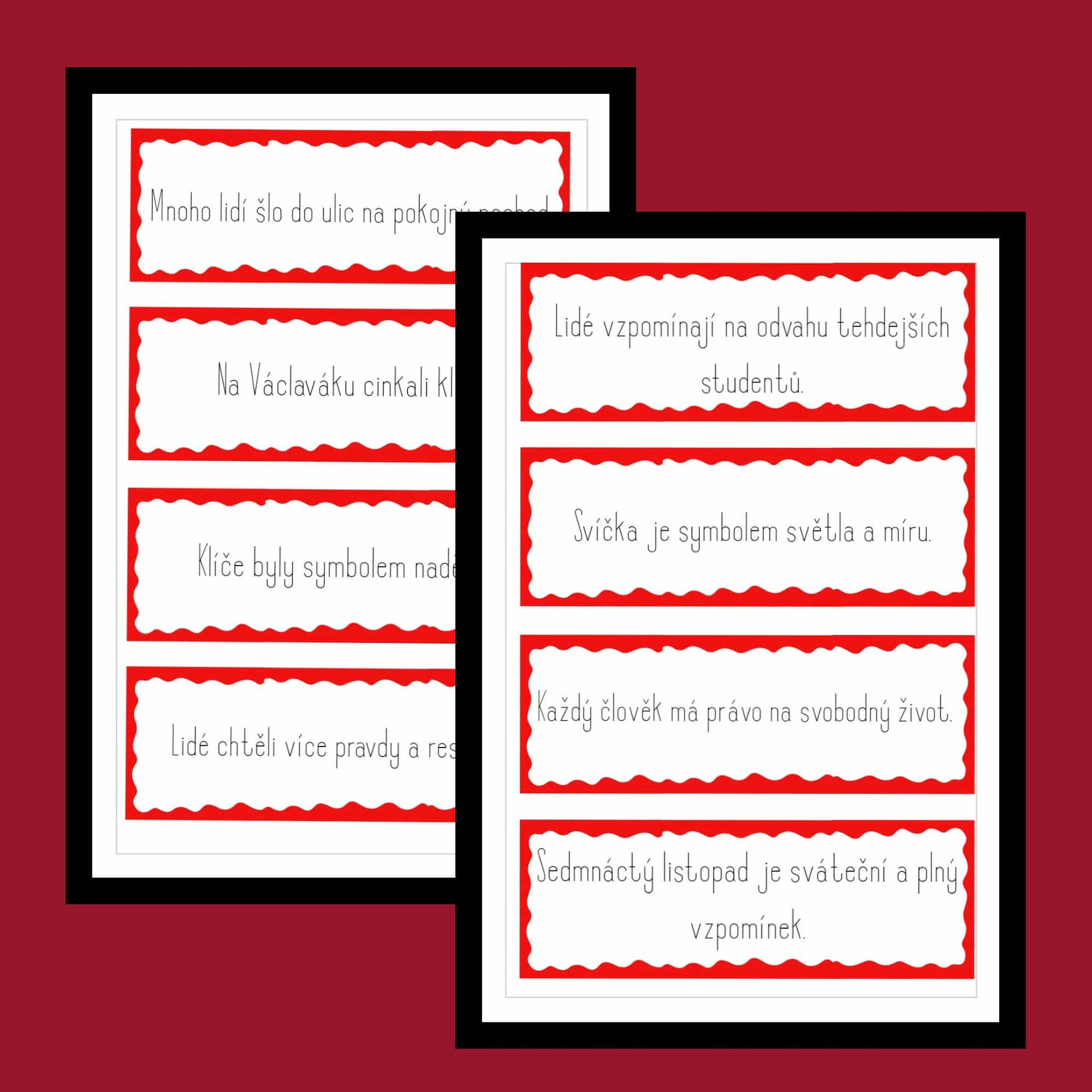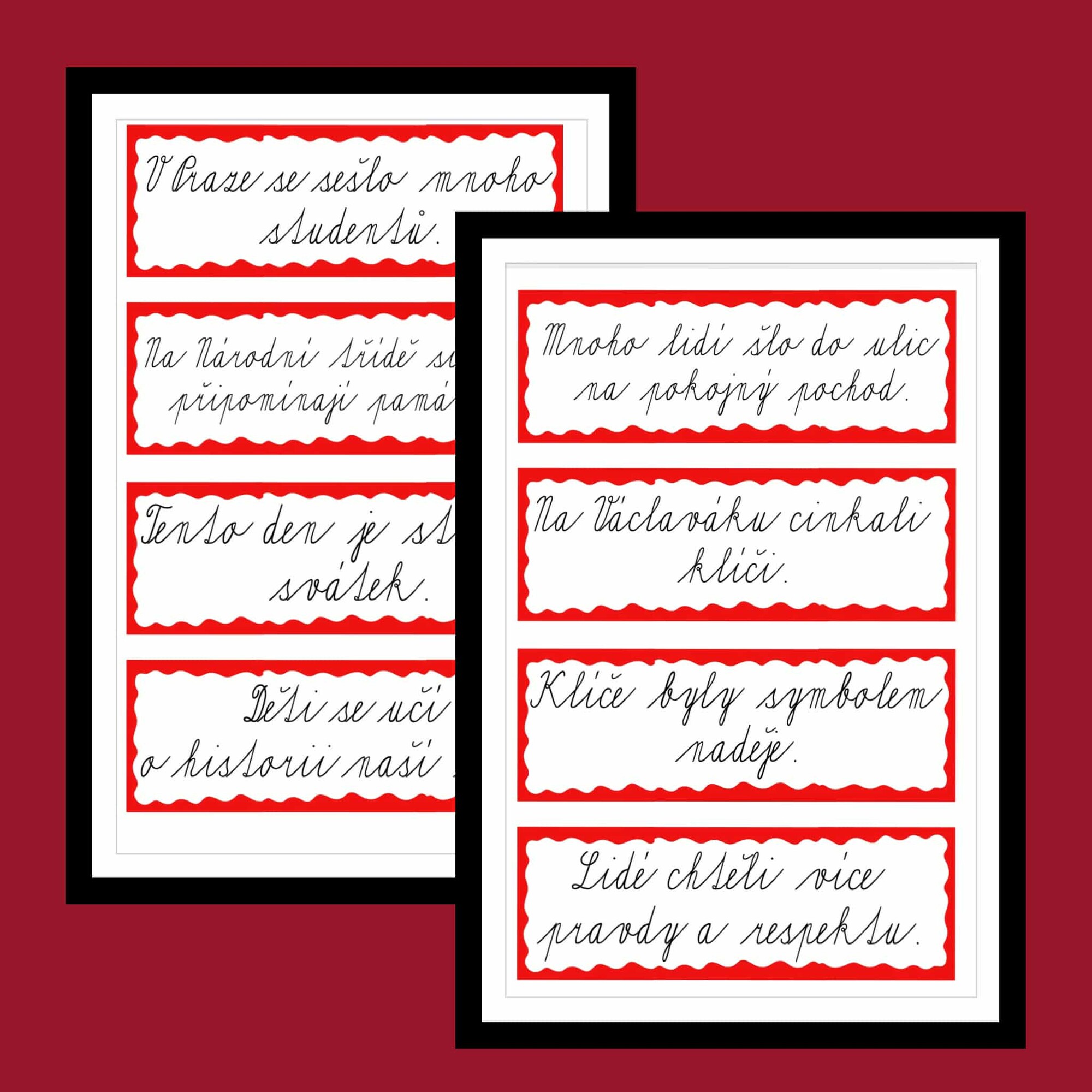 Materiál obsahuje 28 tematických slov a 18 vět zaměřených na události spojené se 17. listopadem, které jsou formulované jednoduše, srozumitelně a věcně správně. Obsah je přizpůsoben žákům 1. stupně, aby porozuměli základním pojmům (svoboda, demokracie, klíče, studenti, Praha) a současně pracovali s textem funkčního charakteru.