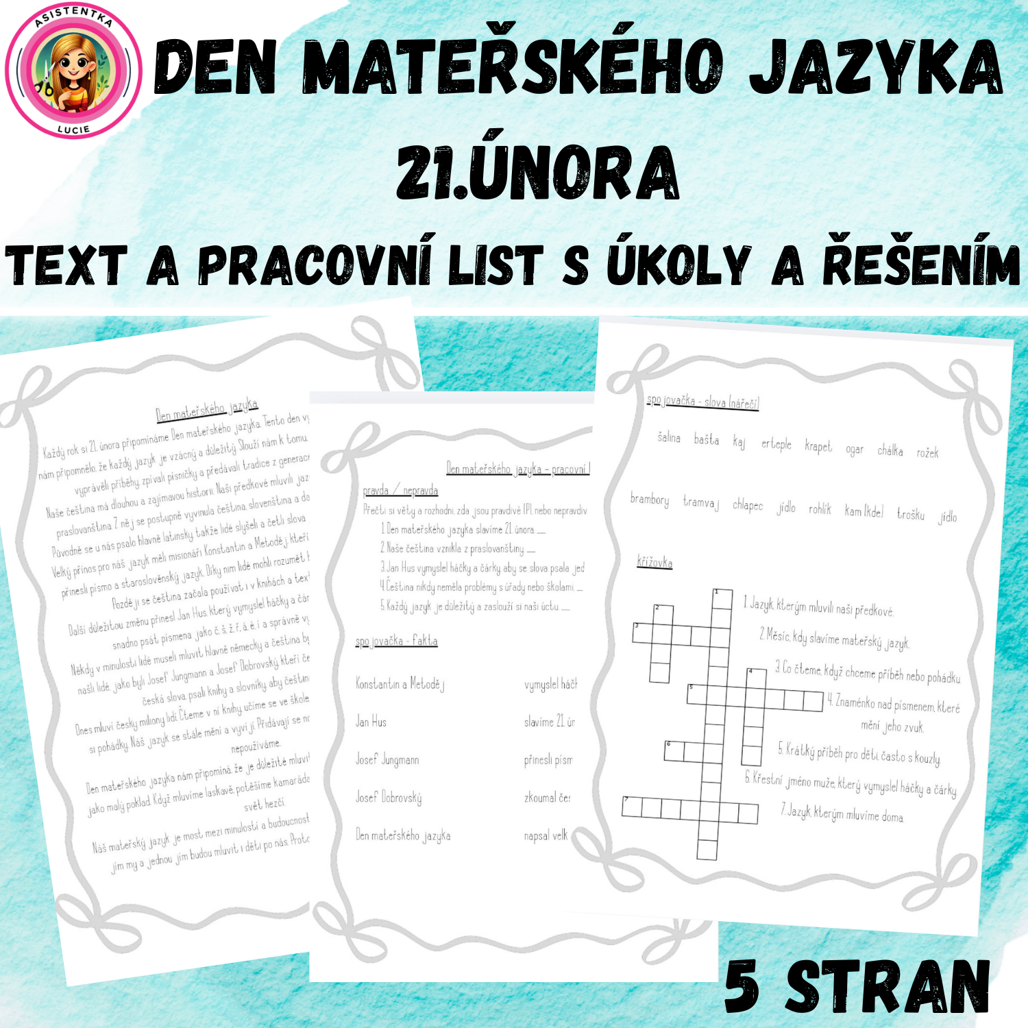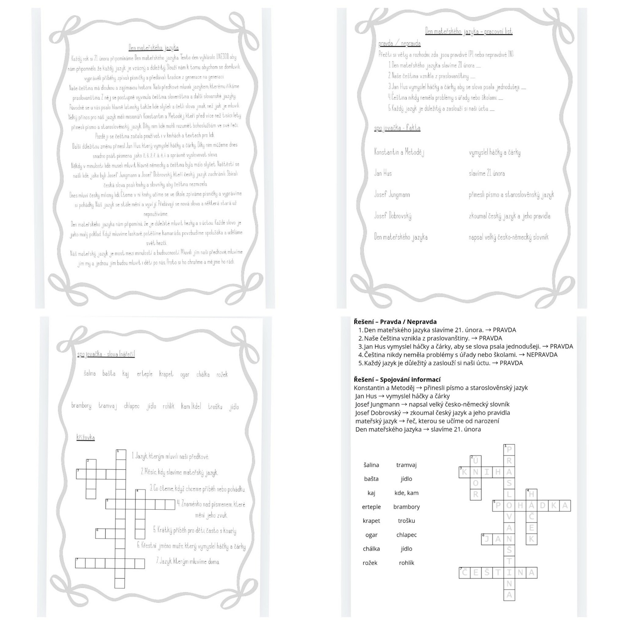 Úvodní text přináší základní informace o vzniku tohoto významného dne, o důležitých osobnostech spojených s českým jazykem (Konstantin a Metoděj, Jan Hus, Josef Jungmann, Josef Dobrovský) a o tom, jak se čeština v průběhu času proměňovala. Text je stylizován tak, aby podporoval čtenářskou gramotnost, porozumění textu a současně vedl žáky k úctě k mateřskému jazyku a ke kultivovanému vyjadřování.