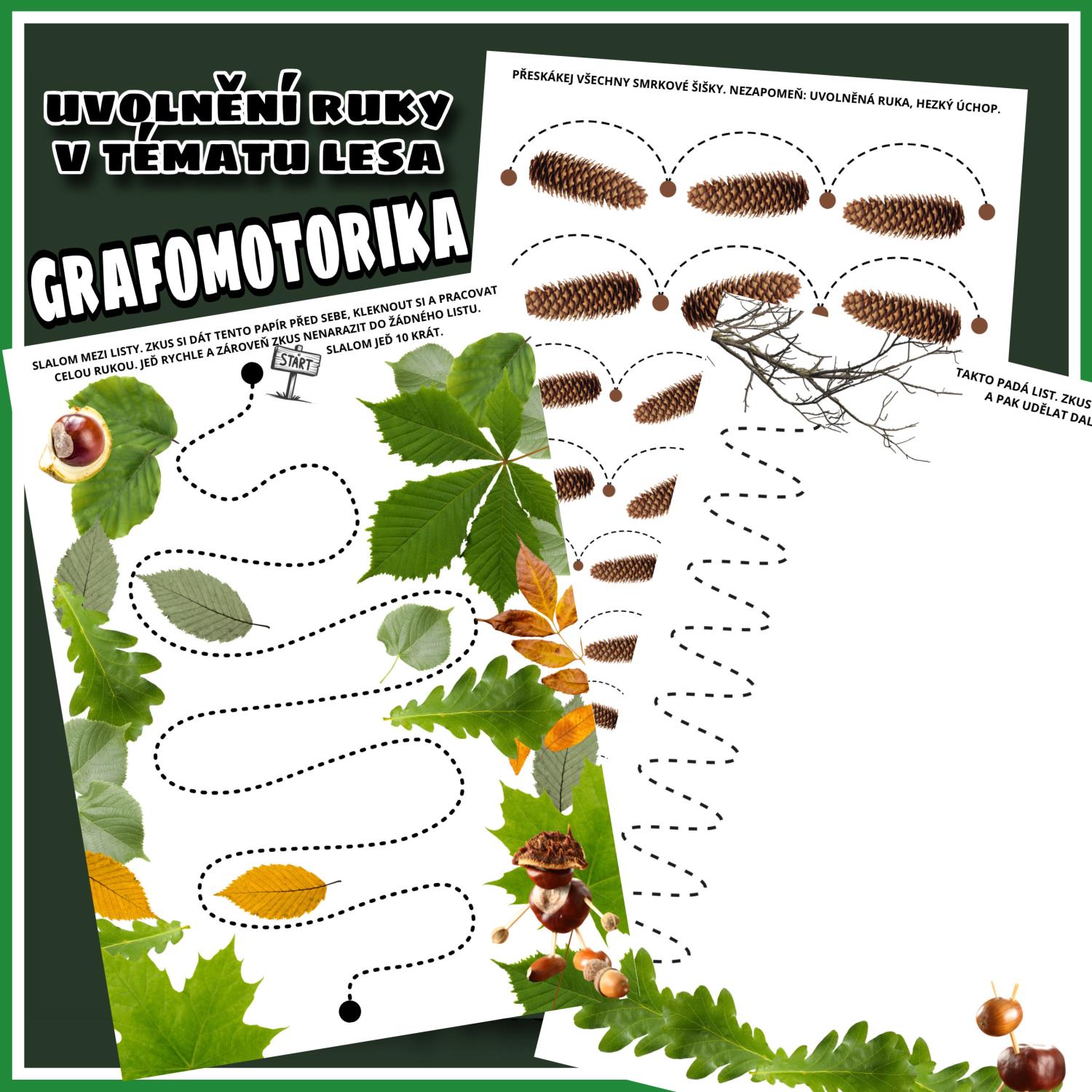 - ✍️ Grafomotorické listy – tři hravé trasy („přes šišky“, „slalom mezi listy“, „takto padá list“) pro nácvik uvolněné ruky a správného pohybu při psaní.