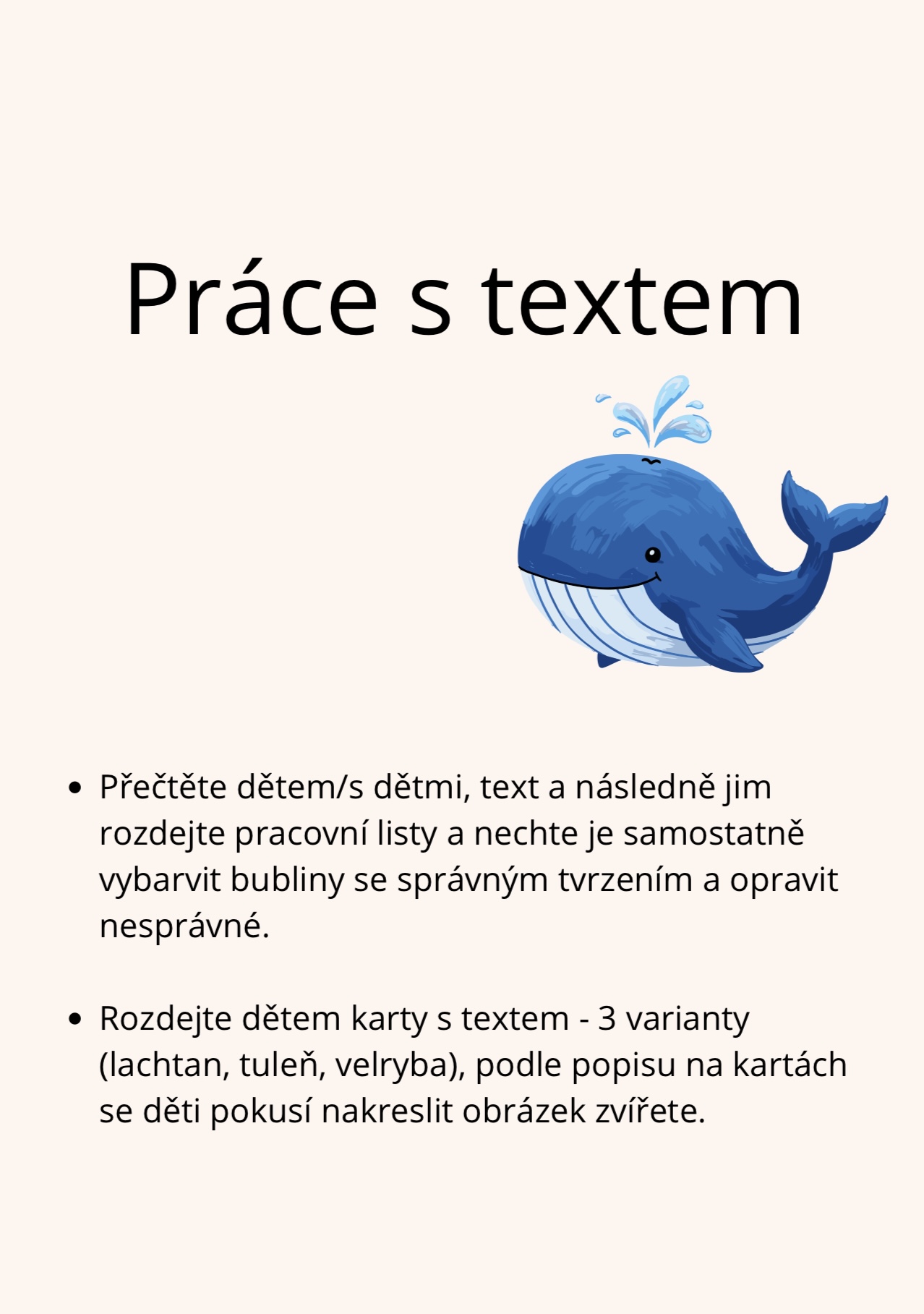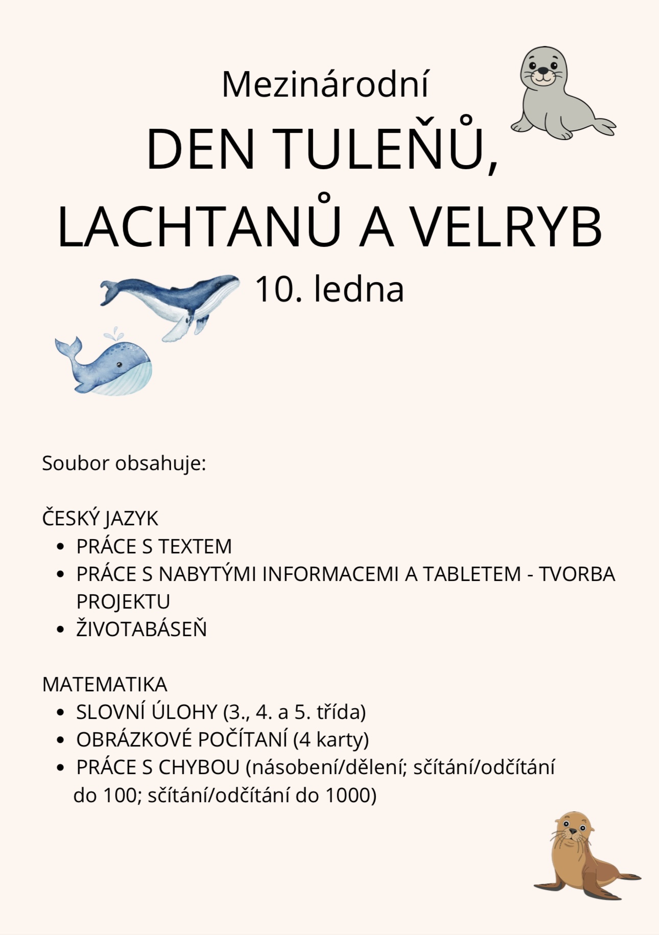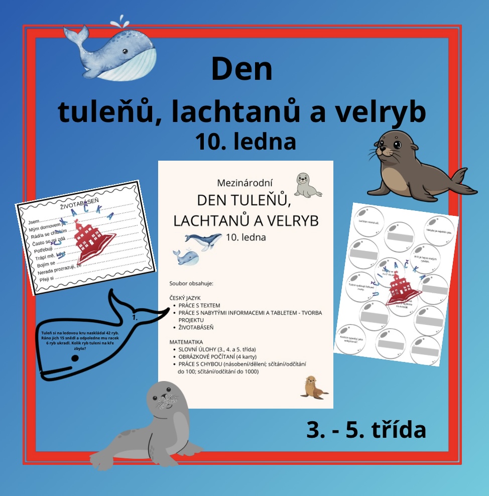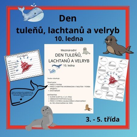 Materiál k projektovému dni na téma ,,tuleňů, lachtanů a velryb". Obsahuje materiály do českého jazyka a matematiky. Děti se dozví něco zajímavého o těchto zvířatech, budou pracovat s textem, slovními úlohami i chybami.