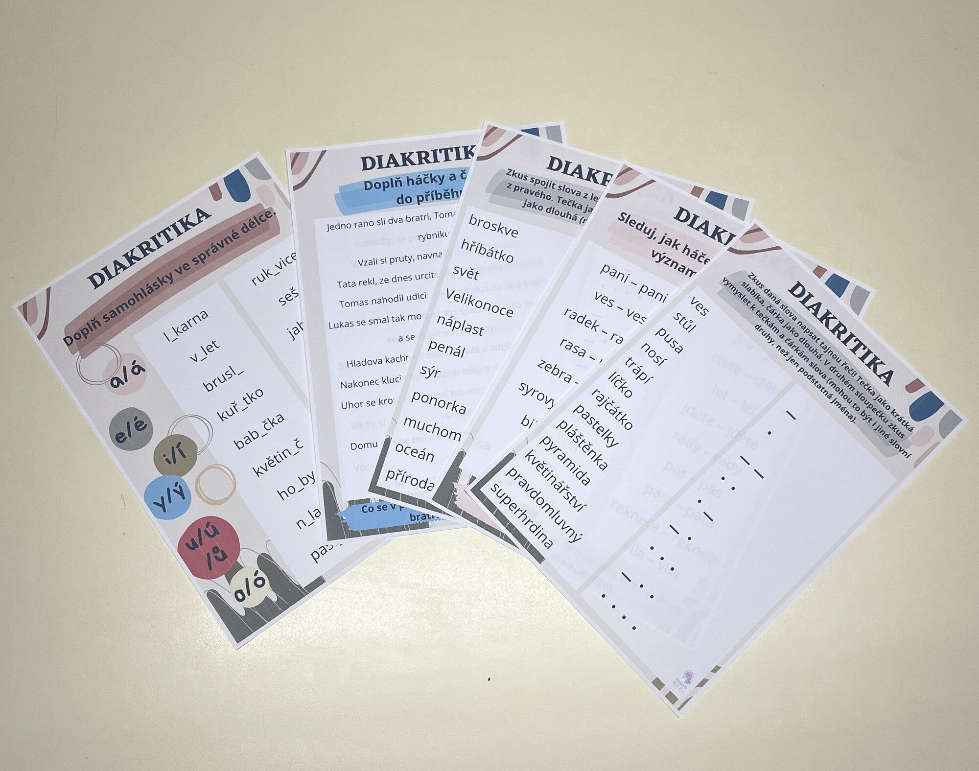 Komplexní sada pracovních listů zaměřená na porozumění a správné používání diakritiky (háčků a čárek) v českém jazyce. Materiál pomáhá dětem lépe si uvědomit, jak drobná změna znaménka ovlivňuje význam slova, a zároveň rozvíjí čtenářské dovednosti, paměť, pozornost i jazykový cit.