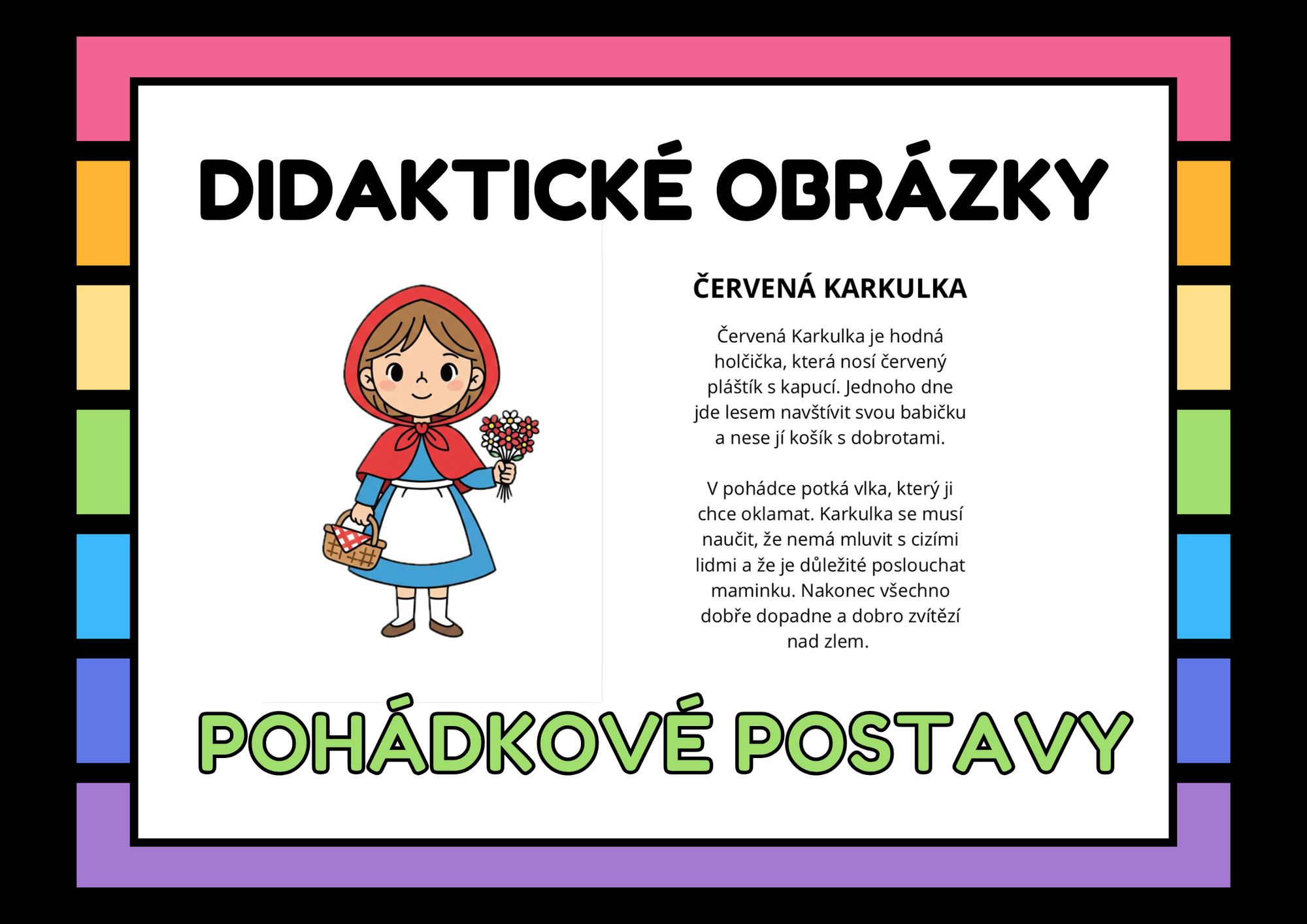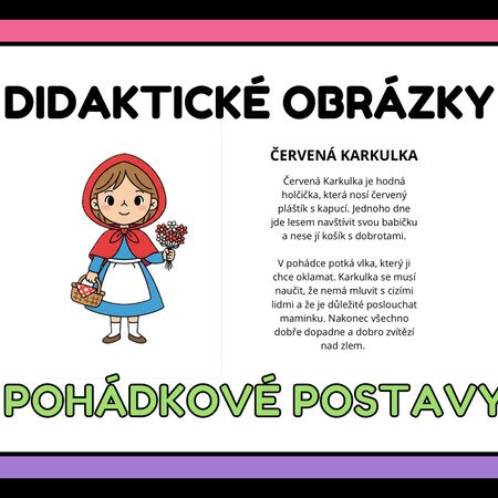Didaktické obrázky k pohádkovým postavám. Každá kartička obsahuje obrázek a popis postavy. Popisy postav jsou koncipované pro děti.