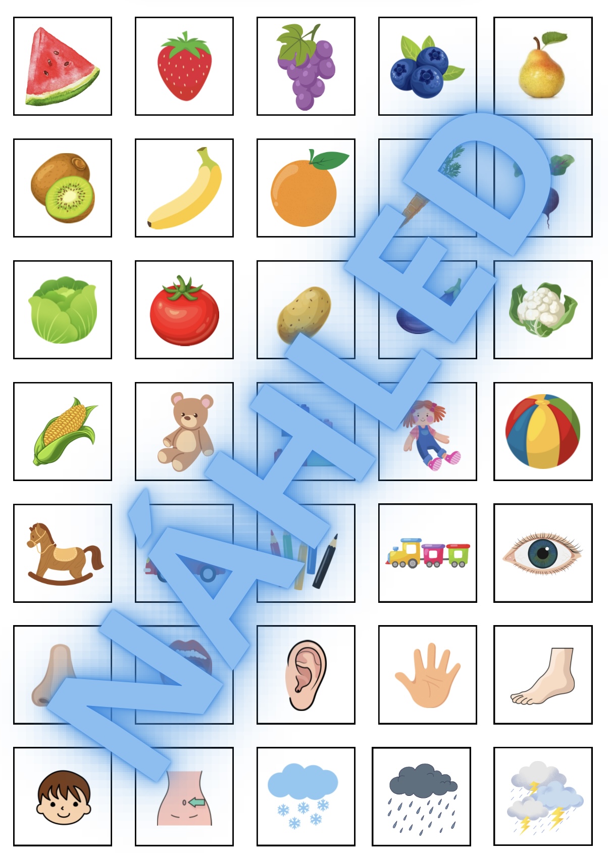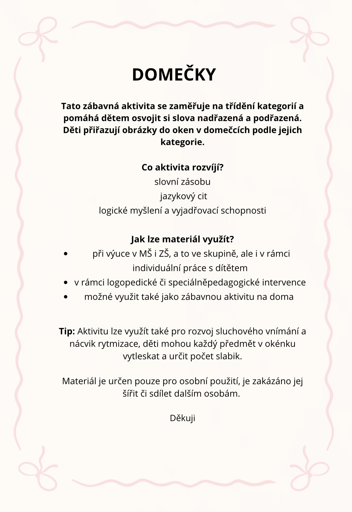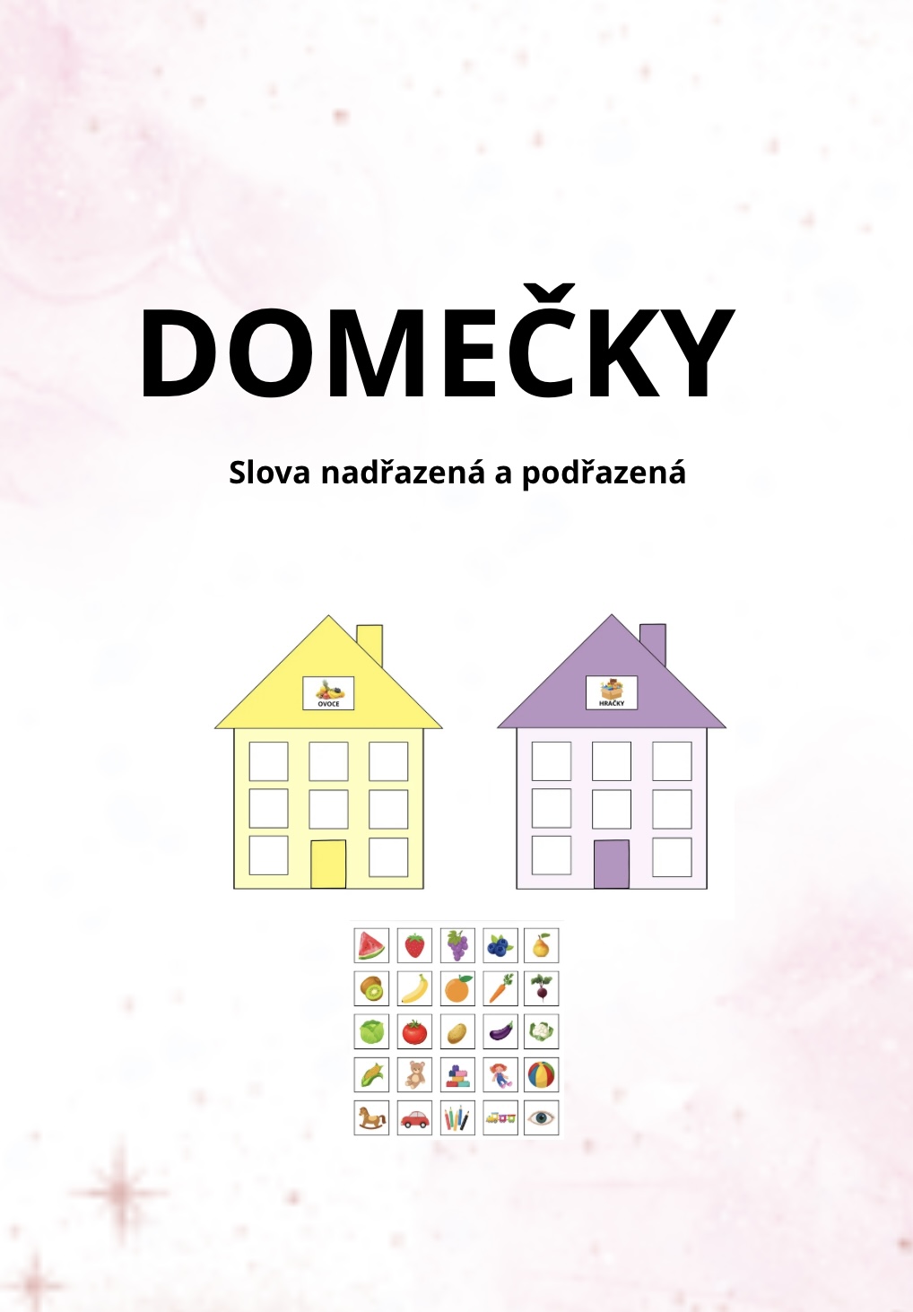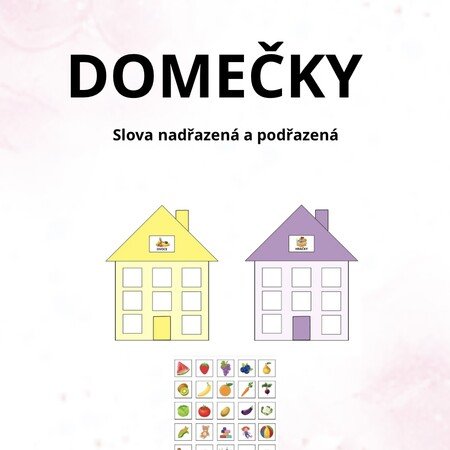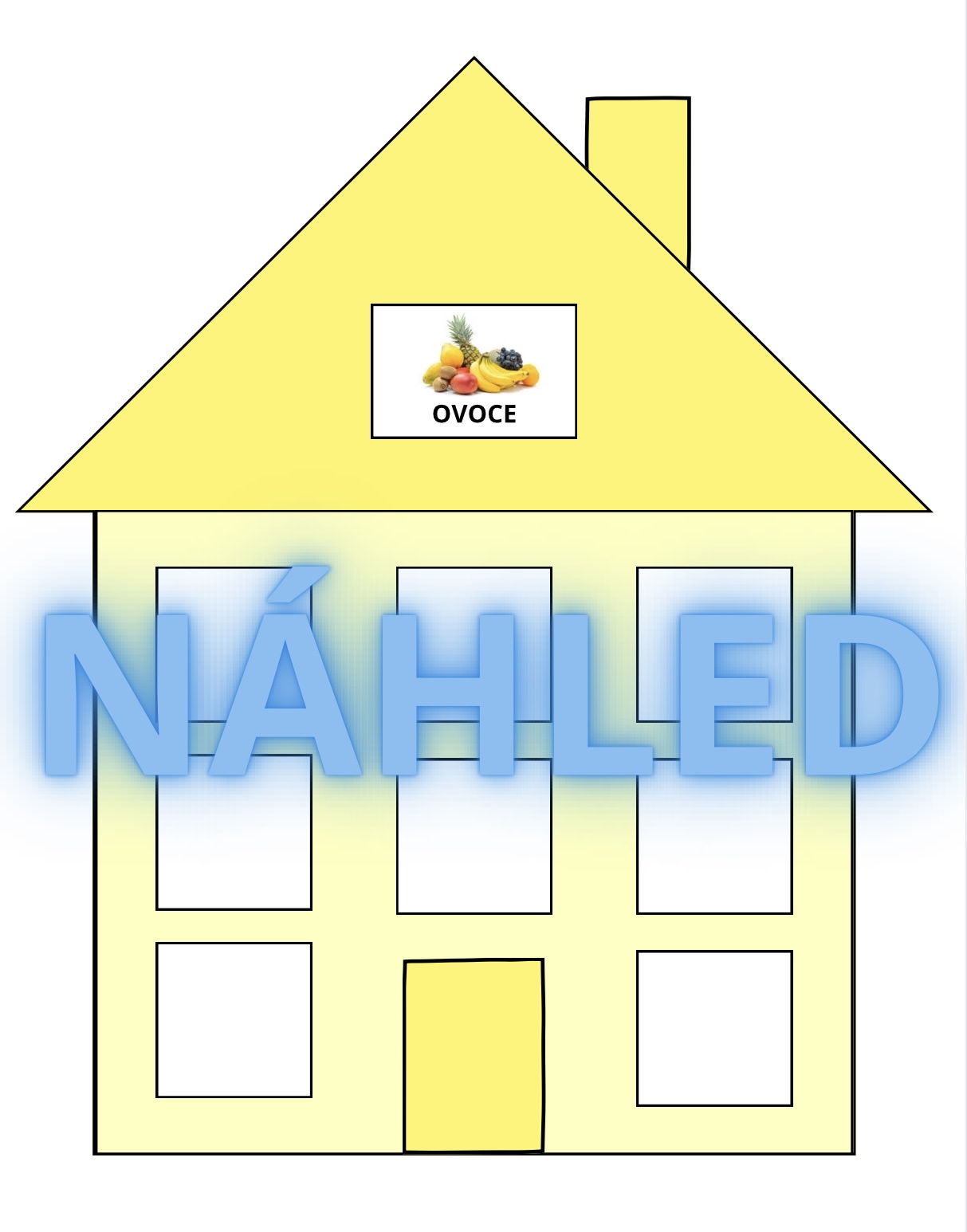 Materiál obsahuje 12 listů, z toho 8 obsahuje jednotlivé kategorie - vždy jeden domeček na jedné straně a 2 listy s podřazenými slovy. Vhodné materiál zalaminovat a nalepit suchý zip na jednotlivá okénka. Soubor zahrnuje tyto kategorie: ovoce, zelenina, hračky, tělo, počasí, oblečení, zvířata, barvy.