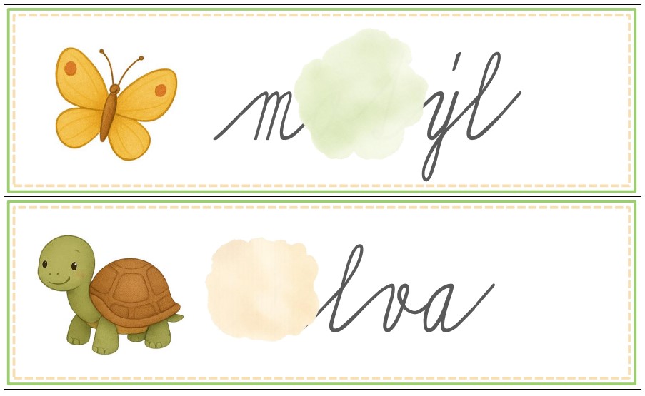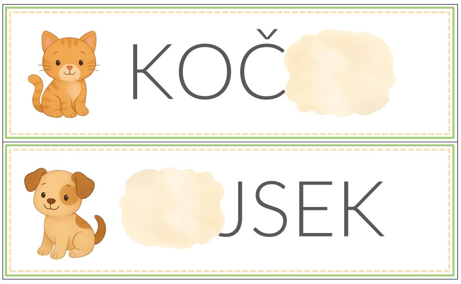 Pomůcka je zaměřena na propojování čtení a psaní a na aktivní práci se slovem. Děti vychází z již napsané části slova, chybějící část dopíší.