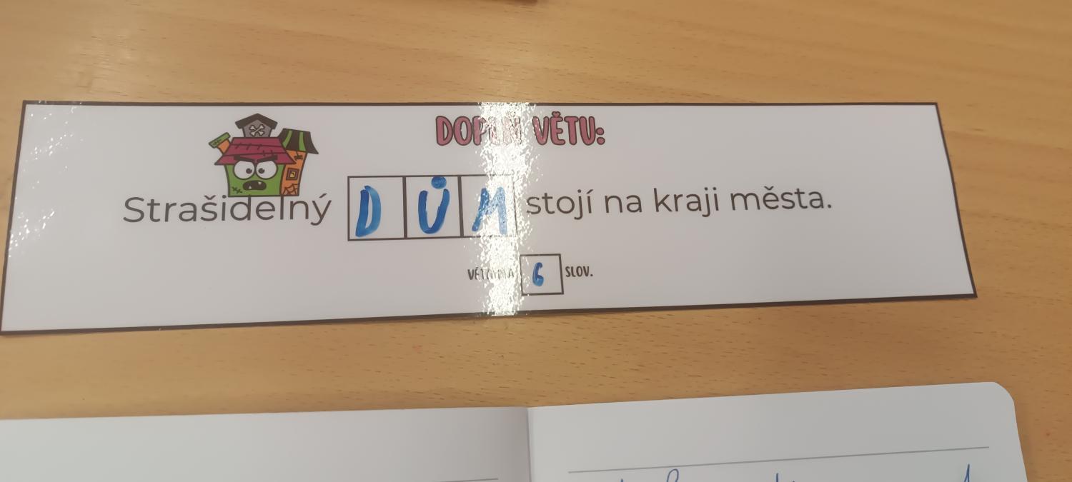 Materiál vytiskněte a pro delší životnost zalaminujte. Jednotlivé kartičky využívají žáci k doplňování slov (stíratelný fix) podle obrázku a k zapsání počtu slov ve větě. Věty lze po doplnění přepsat do sešitu. Při oboustranném tisku si mohou žáci správné řešení samostatně zkontrolovat.