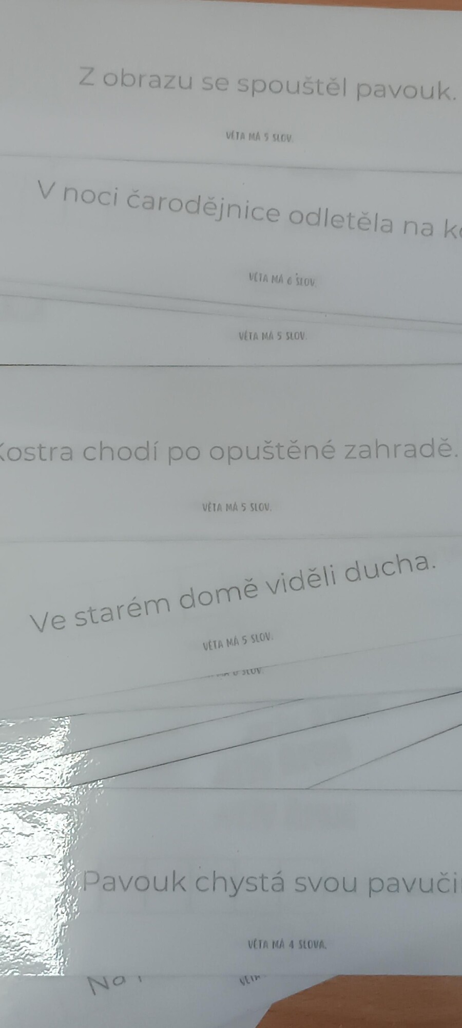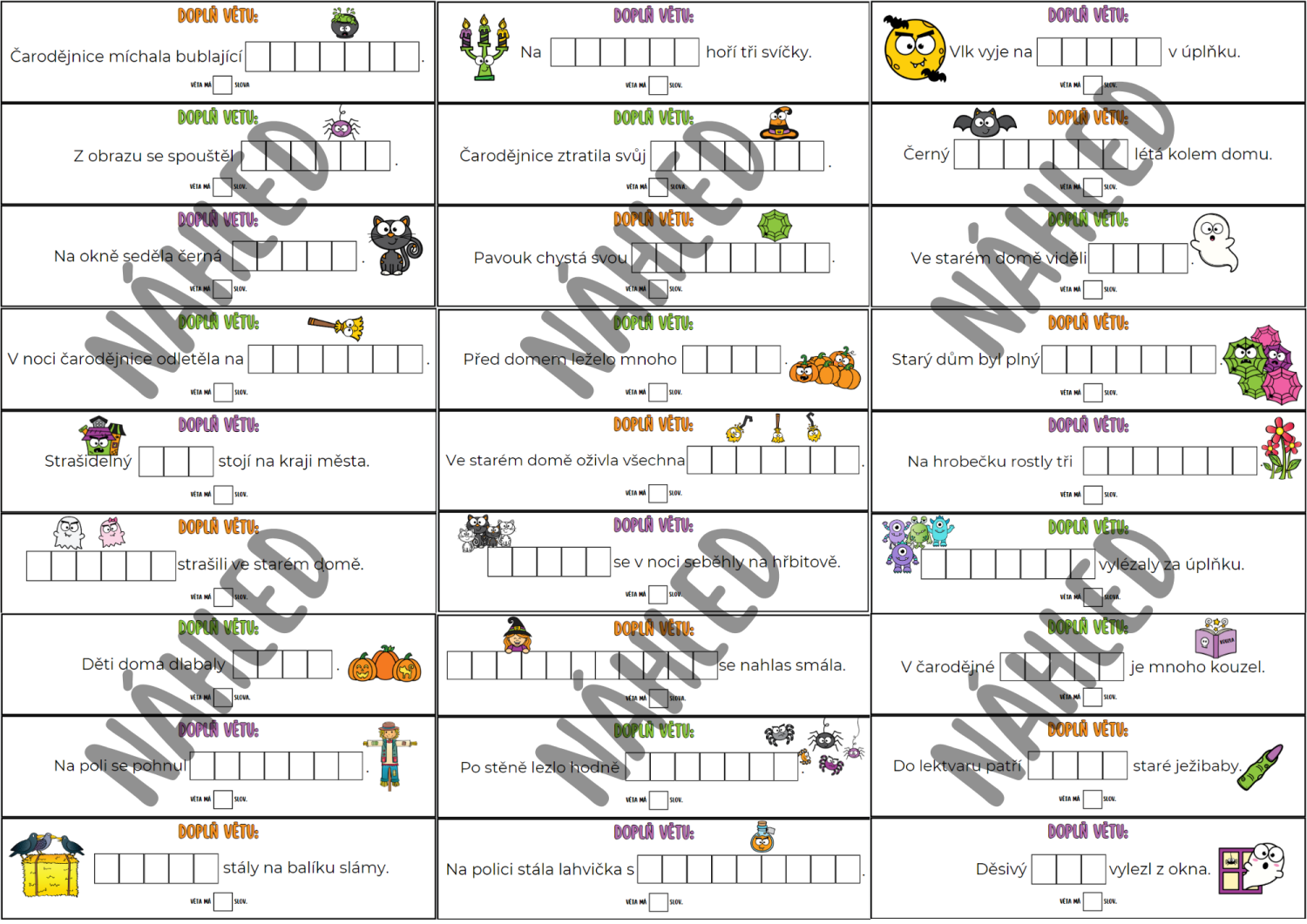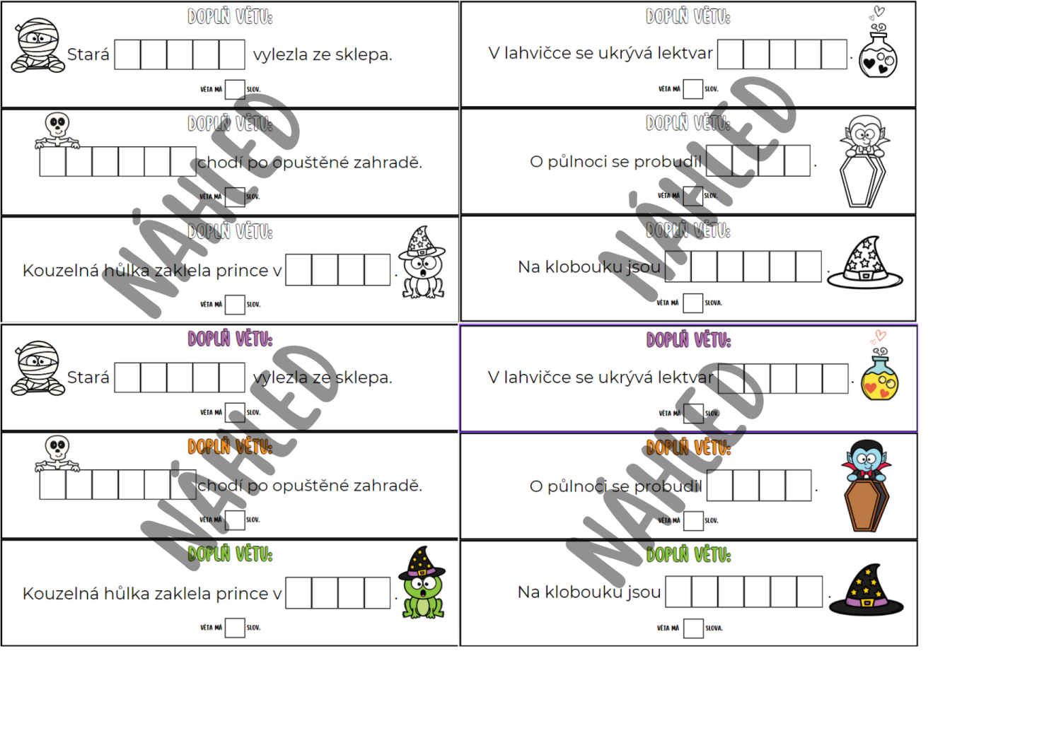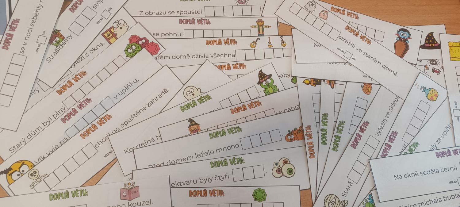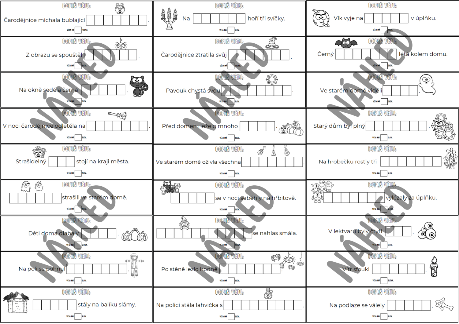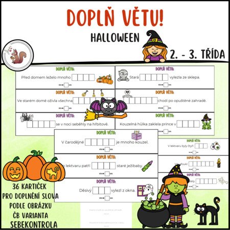 Soubor obsahuje 36 kartiček pro doplnění slova do věty podle obrázku s tematikou Halloween a doplnění počtu slov ve větě. Věty se rovněž dají použít pro určování pádů podstatných jmen.