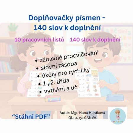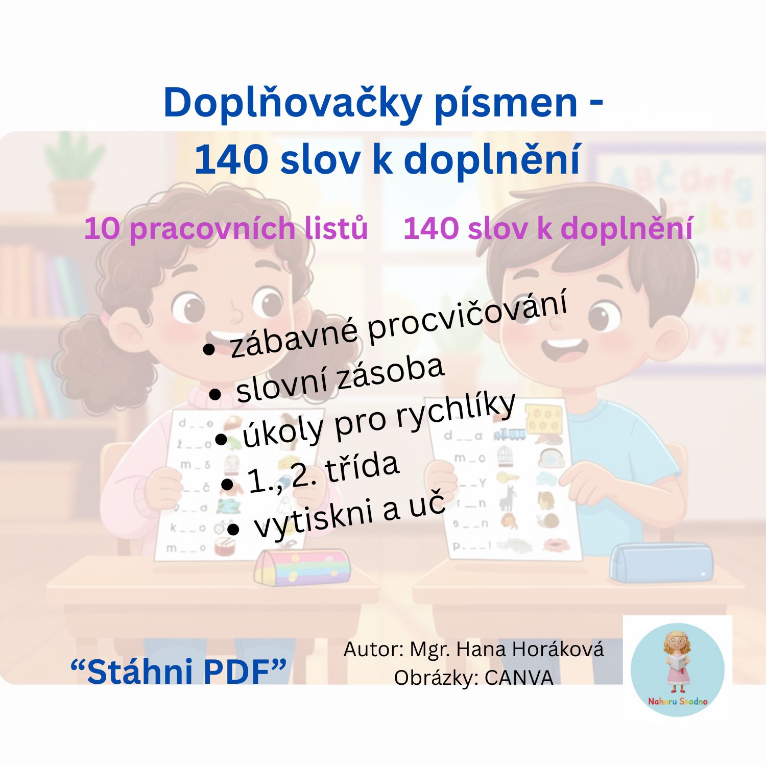 Soubor „Doplňovačky písmen - 140 slov k procvičení” je praktická pomůcka, která dětem usnadní cestu k lepším češtinářským dovednostem a Vám usnadní výuku.