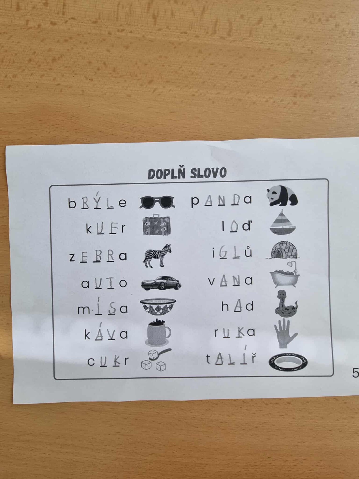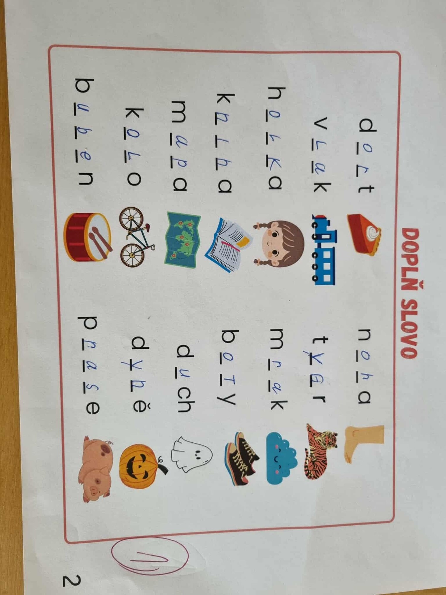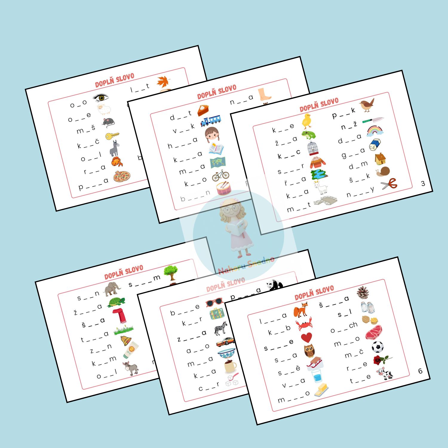 Soubor obsahuje 10 pracovních listů a na každém z nich je připraveno 14 slov s obrázkem, kde děti doplňují chybějící písmena. Celkem tedy získáte 140 slov, což už představuje pěknou zásobu k procvičení i rozšíření slovní zásoby. Jeden z listů je navíc – určený pro vlastní psaní a kreslení slov. Žáci tak mají možnost tvořit, zapisovat, kreslit a objevovat další výrazy, které sami znají. Správnost vyplnění si žáci ověří v přiložených kartičkách řešení.
