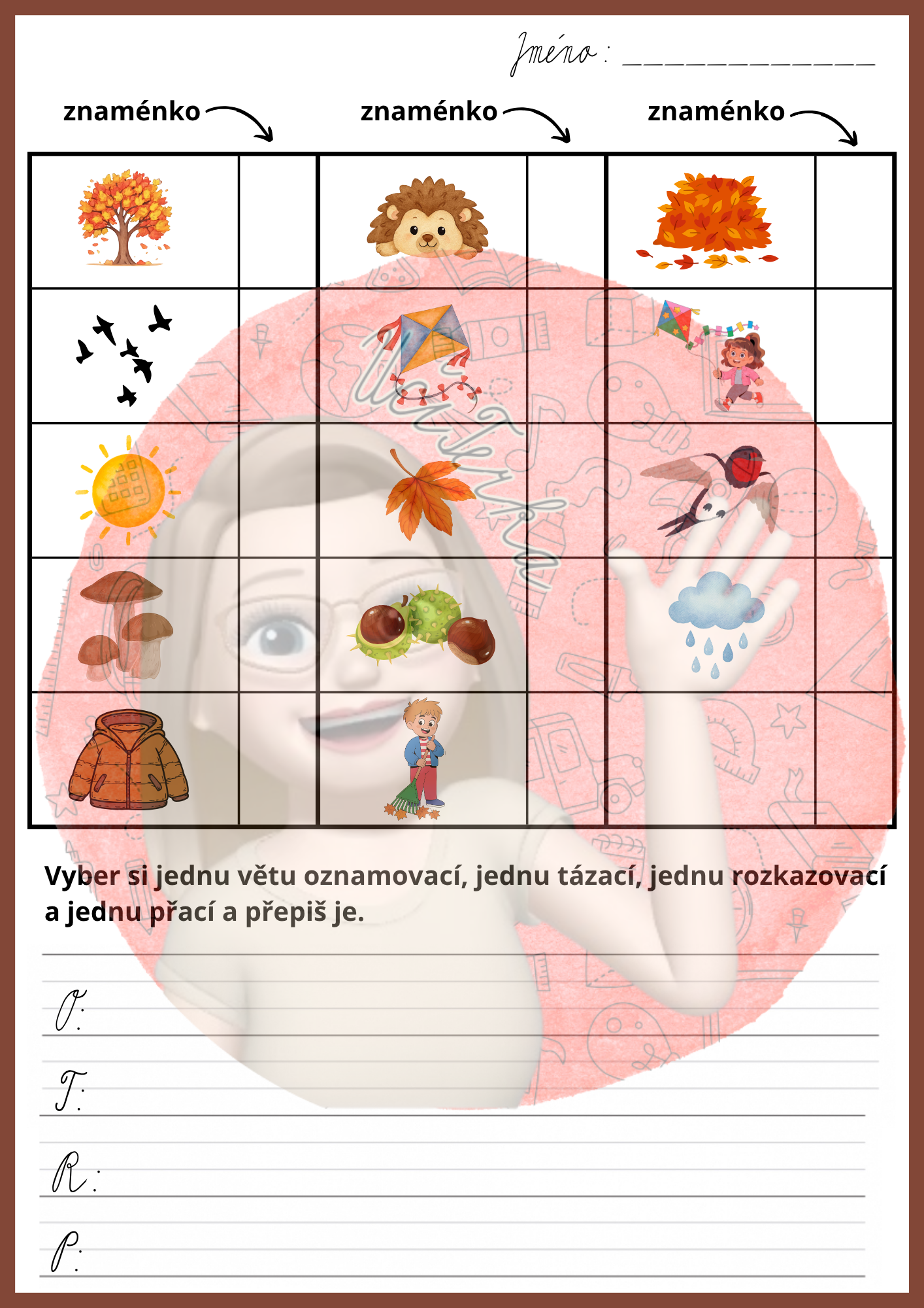 - Žáci si přečtou větu, doplní správné znaménko (., ?, !), zapamatují si obrázek a do pracovního listu zapíší k obrázku správné znaménko.