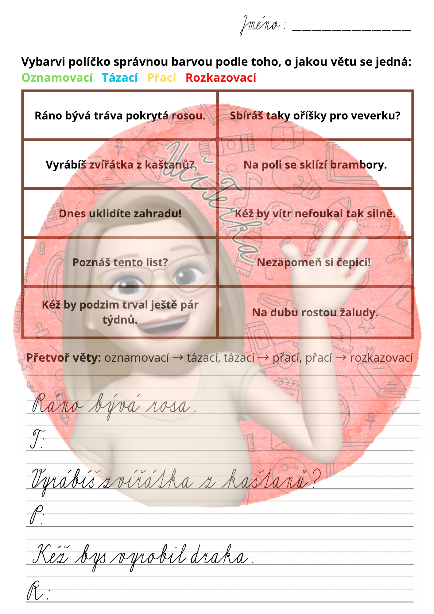 - Poté si každý žák vybere čtyři věty – od každého druhu jednu – a přepíše je do pracovního listu.
