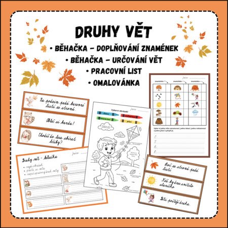 Podzimní aktivity k procvičení druhů vět! Děti určují druhy vět, doplňují znaménka a vybarvují omalovánku s podzimní tematikou.