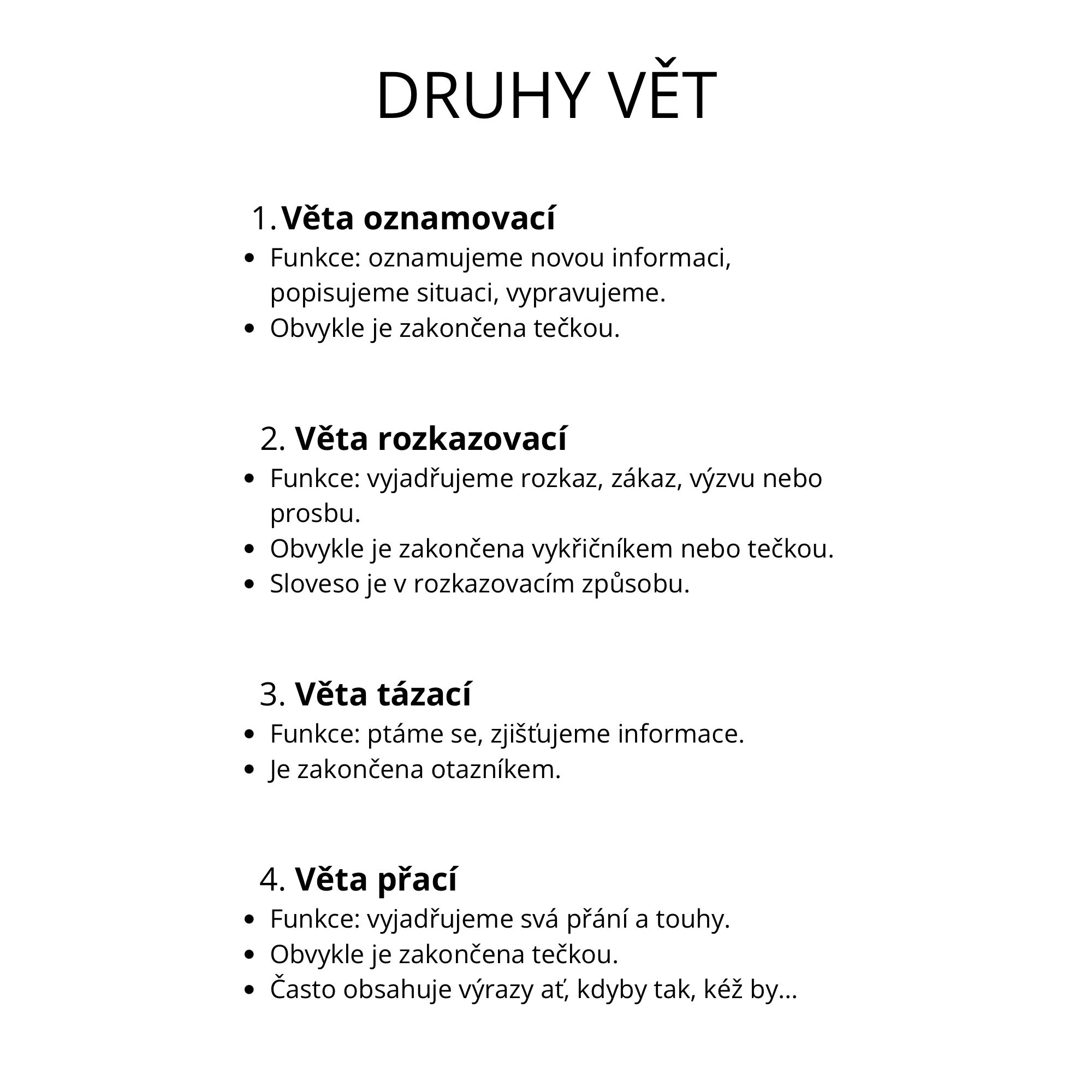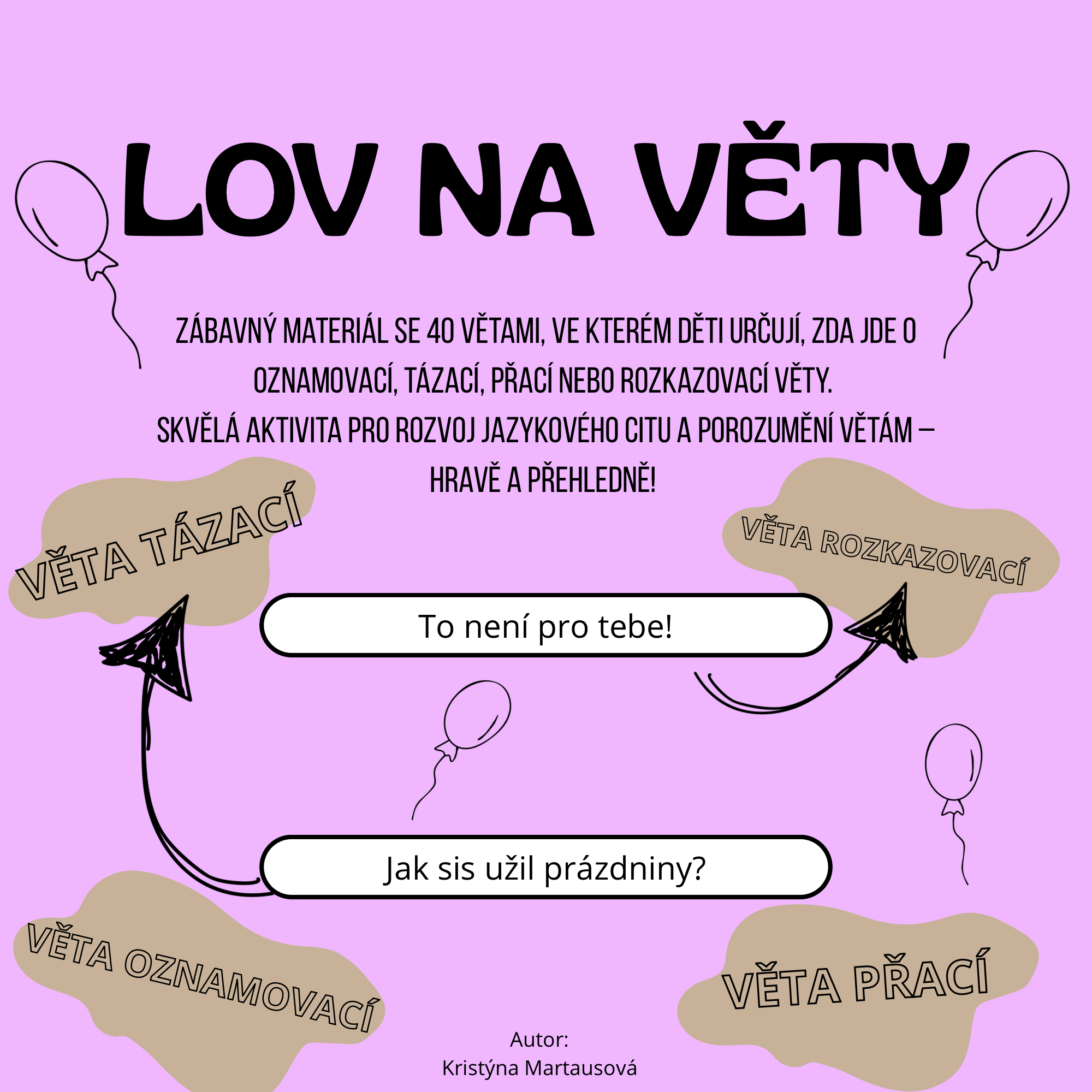 Zábavný materiál se 40 větami, ve kterém děti určují, zda jde o oznamovací, tázací, přací nebo rozkazovací věty. ✨