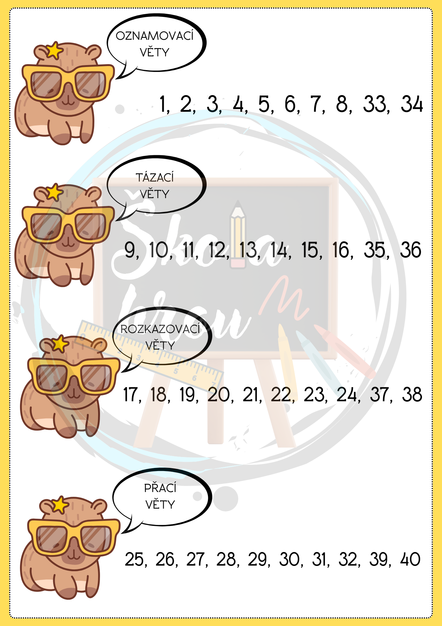 Materiál obsahuje věty oznamovací, tázací, rozkazovací a přací.