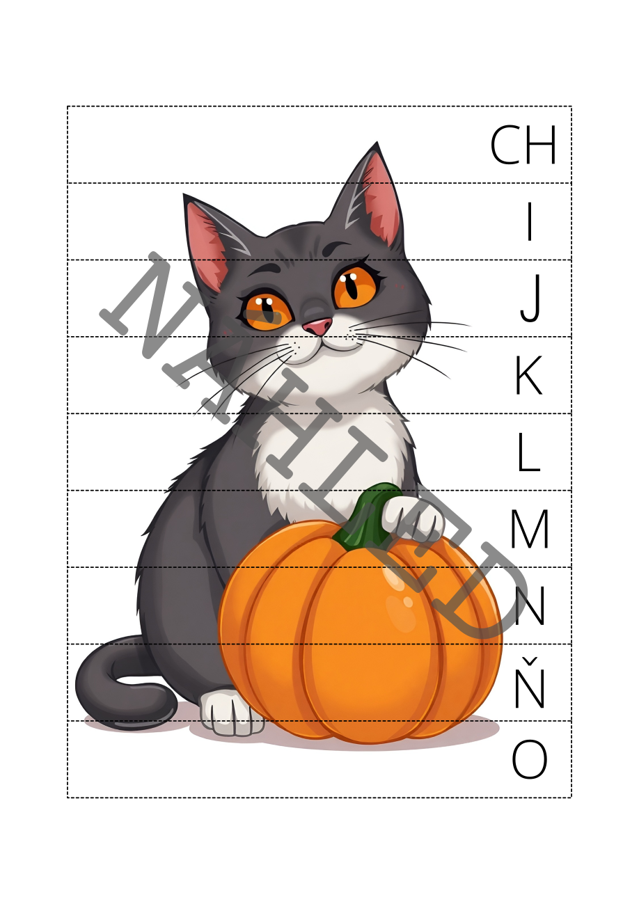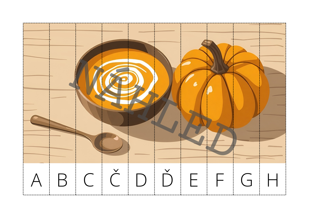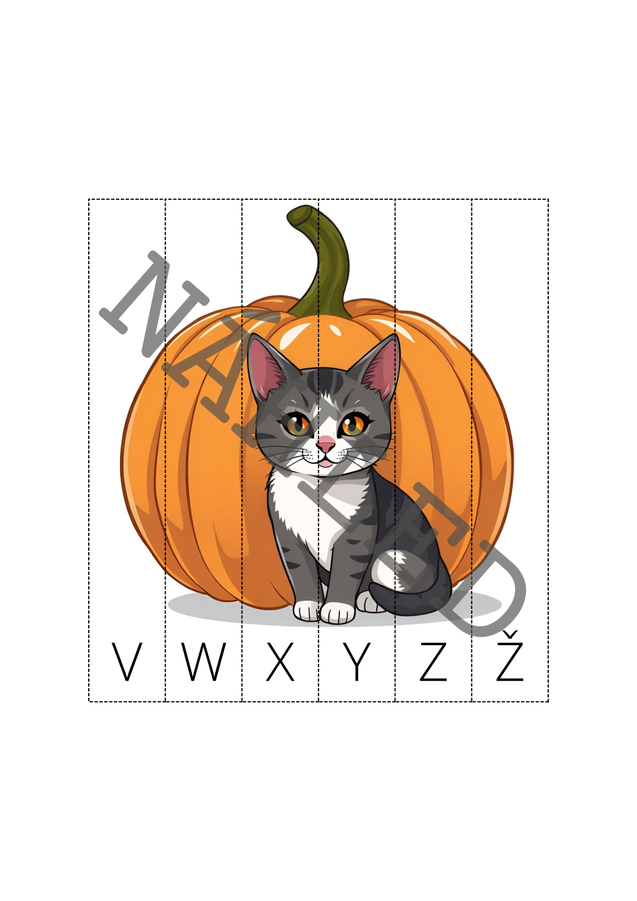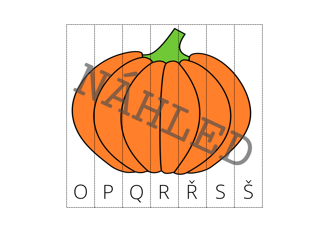 Materiál obsahuje skládačky pěti obrázků, na kterých je dýně (dýňová polévka s dýní, kočka s dýní, dýně, strašák s dýněmi, koťátko s dýní).