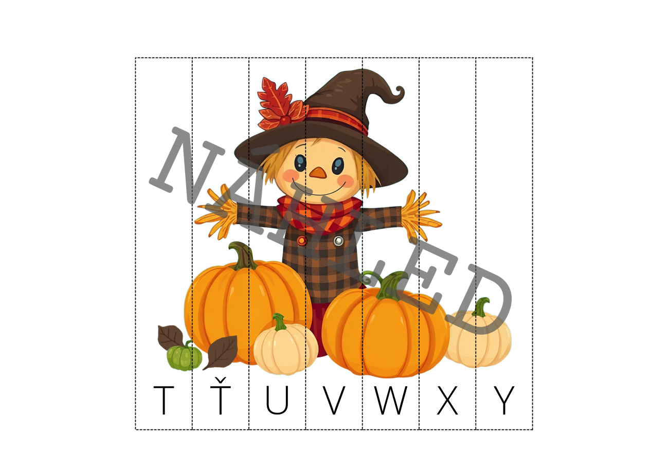 Vybrané stránky se skládačkami vytiskněte. Skládačky rozstříhejte podle přerušovaných čar. Jednotlivé části skládaček můžete zalaminovat. Děti skládají obrázky. Jednotlivé části skládačky musí být seřazeny tak, aby písmena na nich byla řazena abecedně.