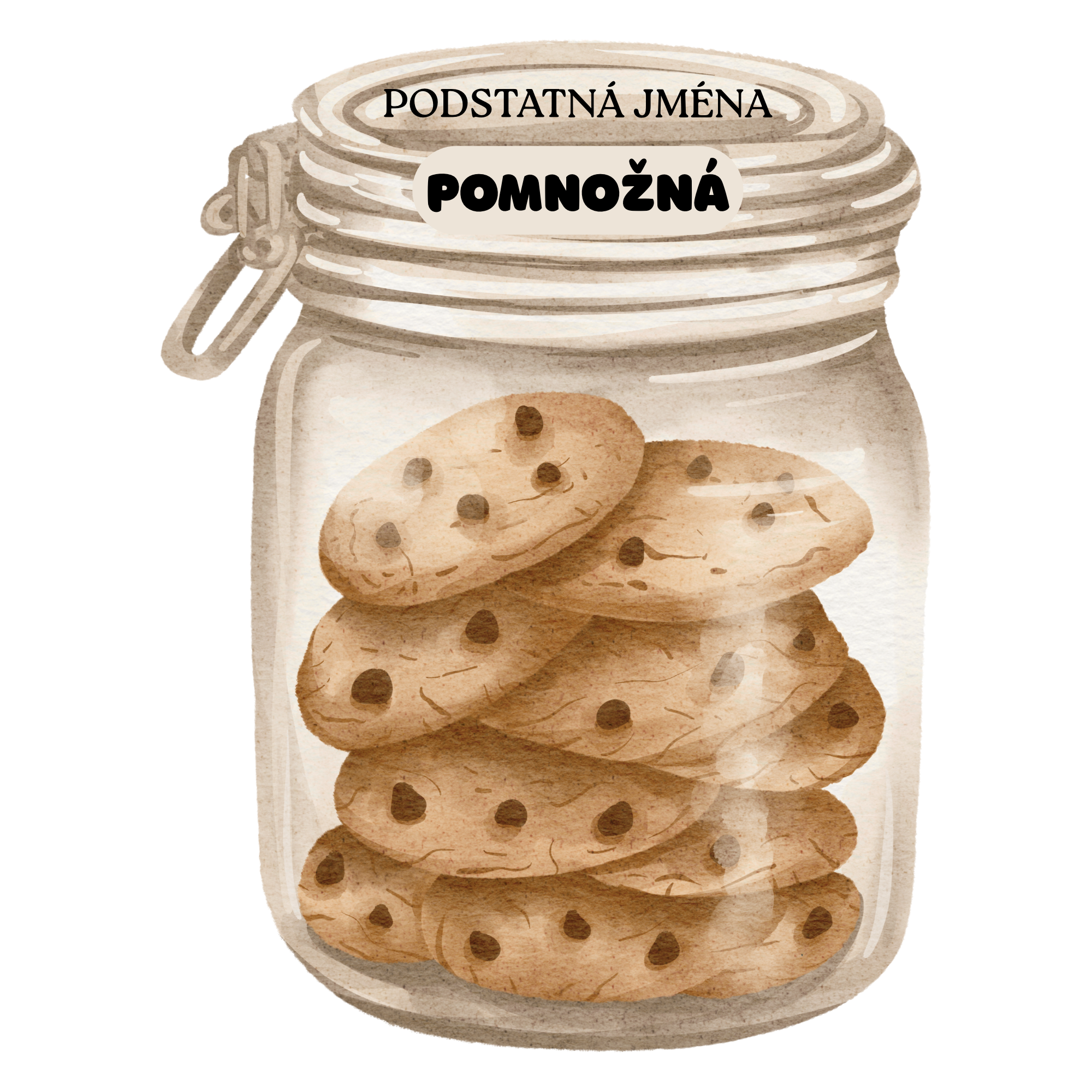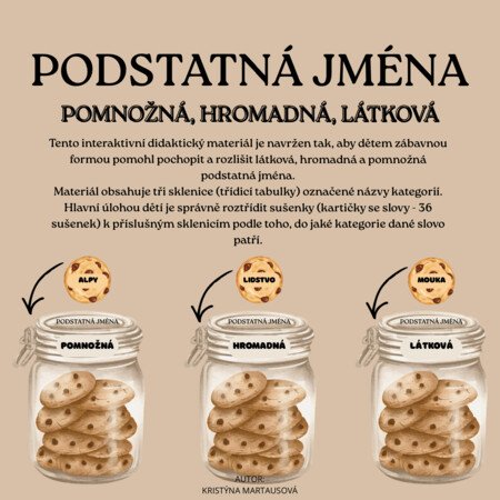 Děti si nejprve zopakují, co je podstatné jméno látkové (nedá se spočítat), hromadné (označuje skupinu, je jen v jednotném čísle) a pomnožné (označuje jednu věc, ale je v množném čísle). Poté třídí jednotlivé sušenky do správných sklenic podle definice.