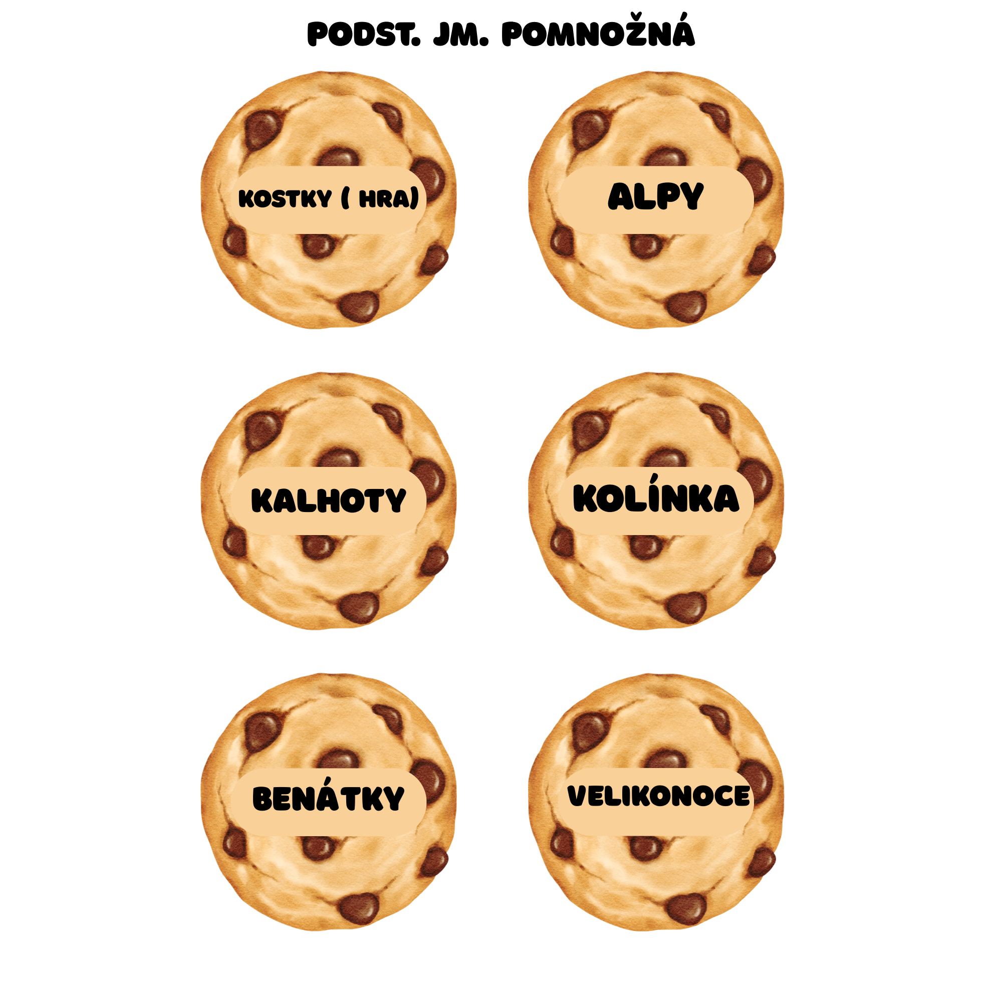 - Sušenky ke třídění: 36 kartiček se slovy (podstatnými jmény), které musí děti správně zařadit.