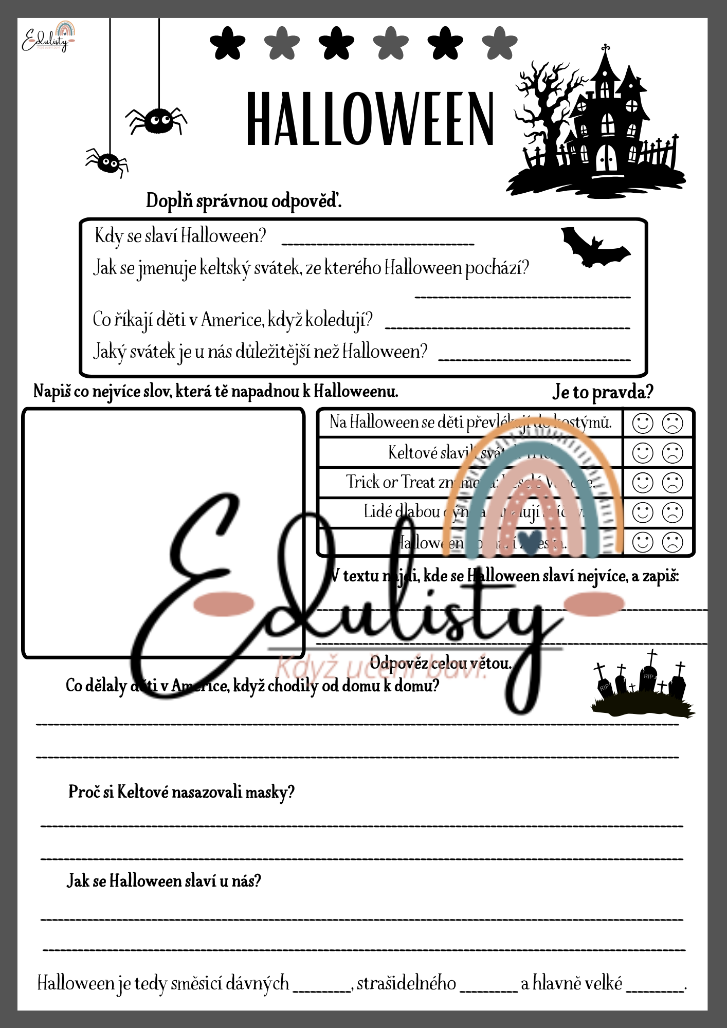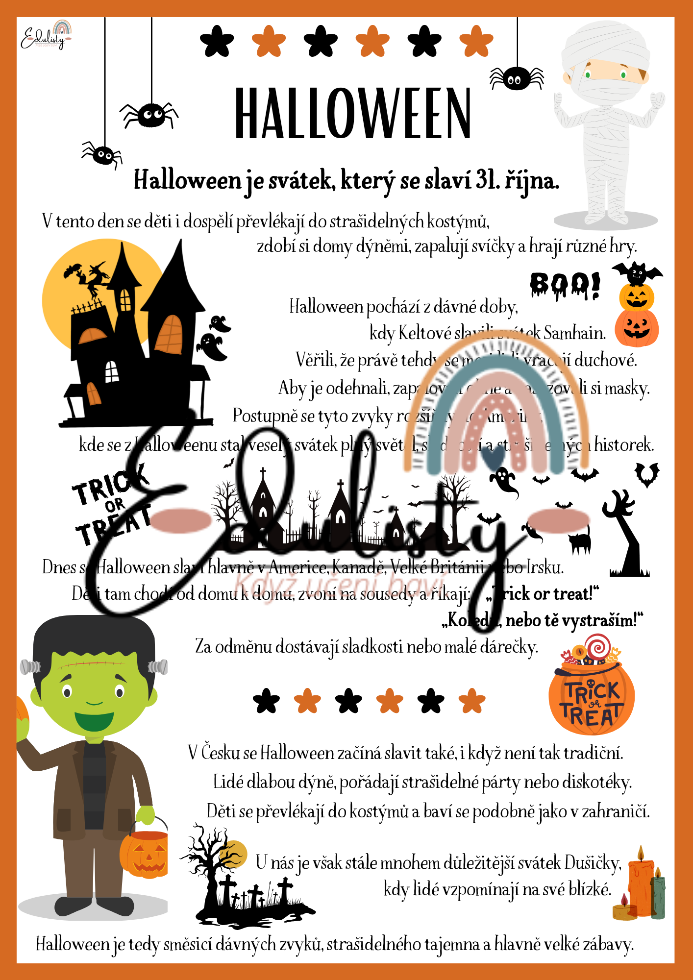 Tento tematický balíček dětem představí Halloween zábavnou a vzdělávací formou. Obsahuje poutavé plakáty s textem a obrázky, které přibližují historii, zvyky a zajímavosti spojené s tímto svátkem. Pracovní listy jsou zaměřené na čtenářskou gramotnost, porozumění textu a tvořivé psaní. Díky přehlednému zpracování se skvěle hodí i pro tematický den nebo projektové vyučování.