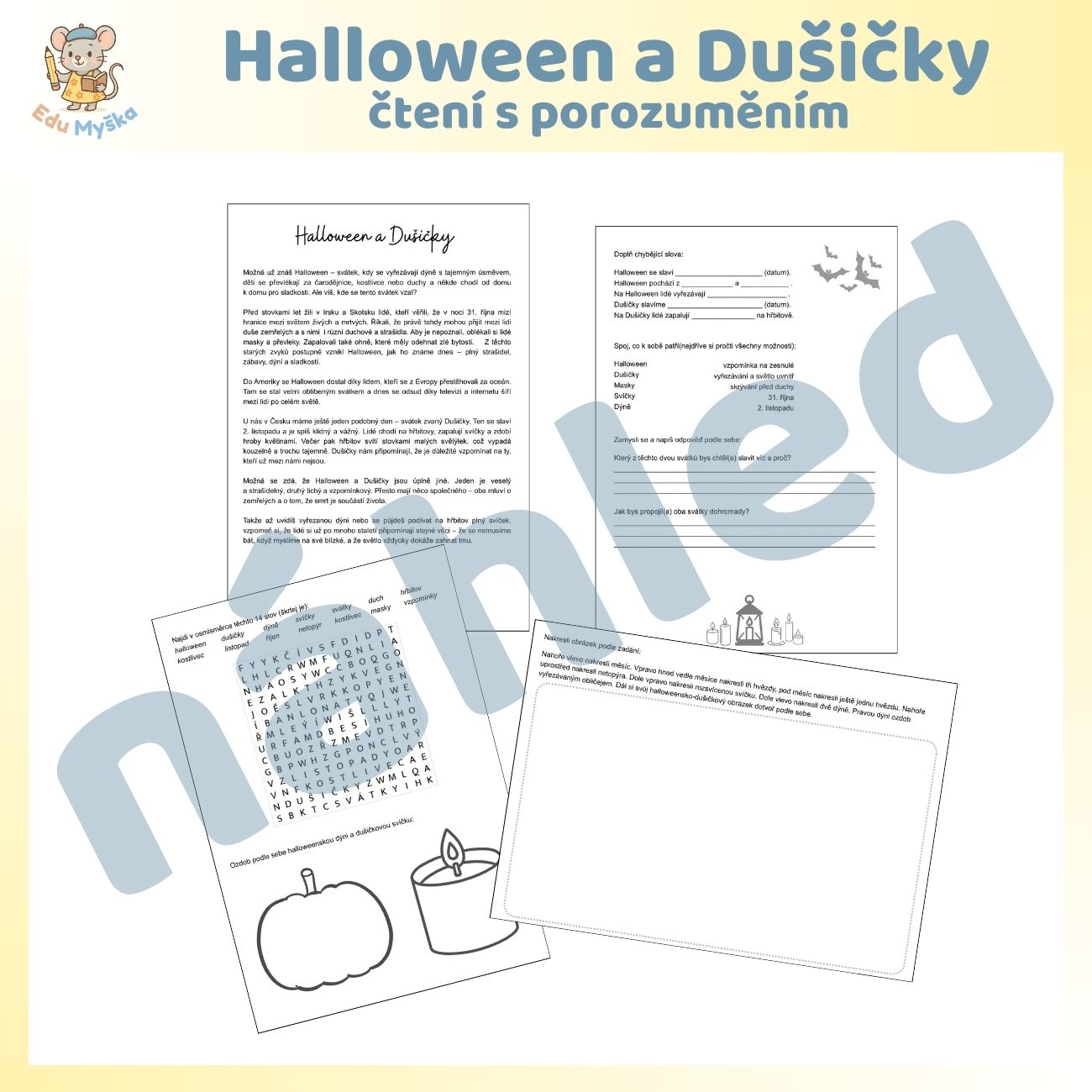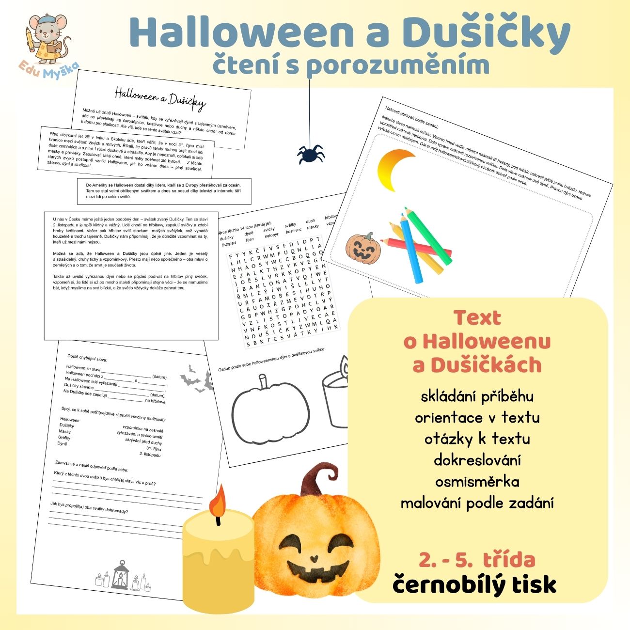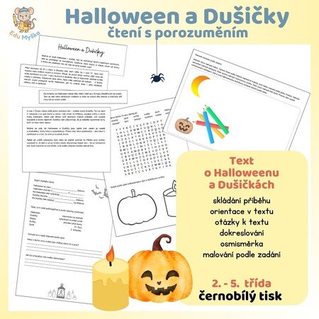 Text o Halloweenu a Dušičkách, který je možné po odstavcích rozstříhat a žáci mají za úkol ho složit a nalepit na nový papír.