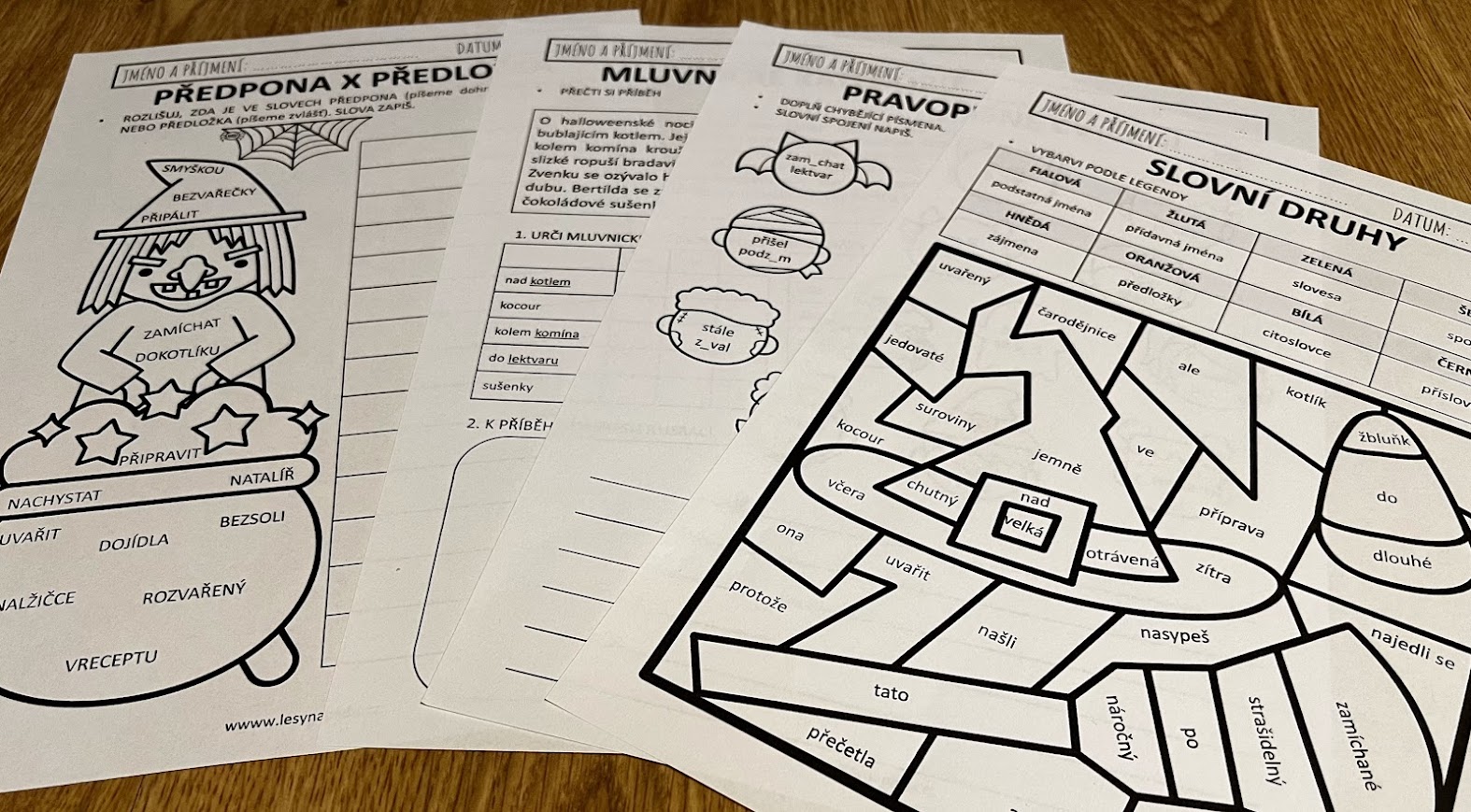 •1 pracovní list – příběh o čarodějnici, mluvnické kategorie podstatných jmen (pád, rod, číslo) a sloves (osoba, číslo, čas)
