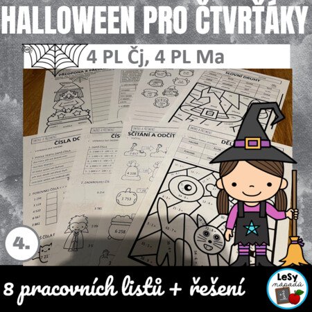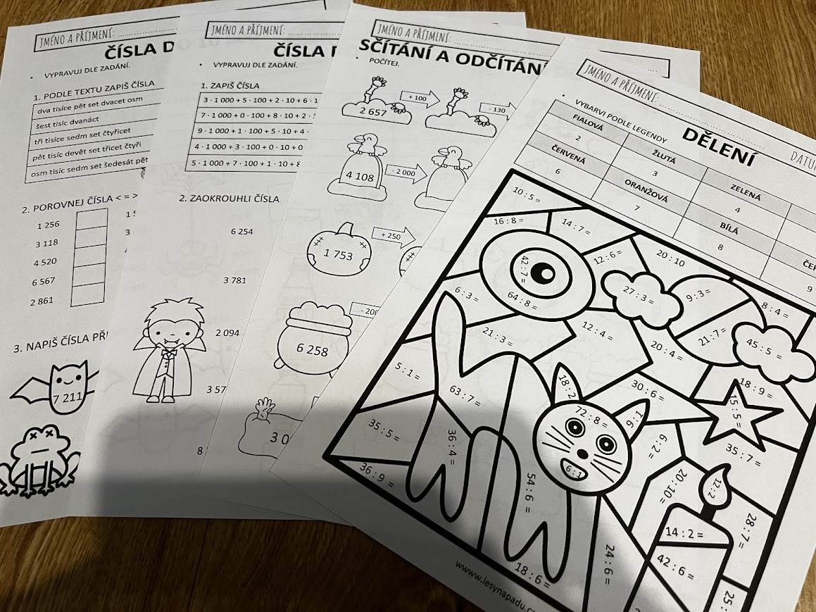 OKRUHY: Halloween, předpony x předložky, vyjmenovaná slova, slovní druhy, mluvnické kategorie podstatných jmen, mluvnické kategorie sloves, čísla do 10 000, porovnávání čísel, zaokrouhlování na desítky, stovky, tisíce, sčítání a odčítání do 10 000, dělení, omalovánka