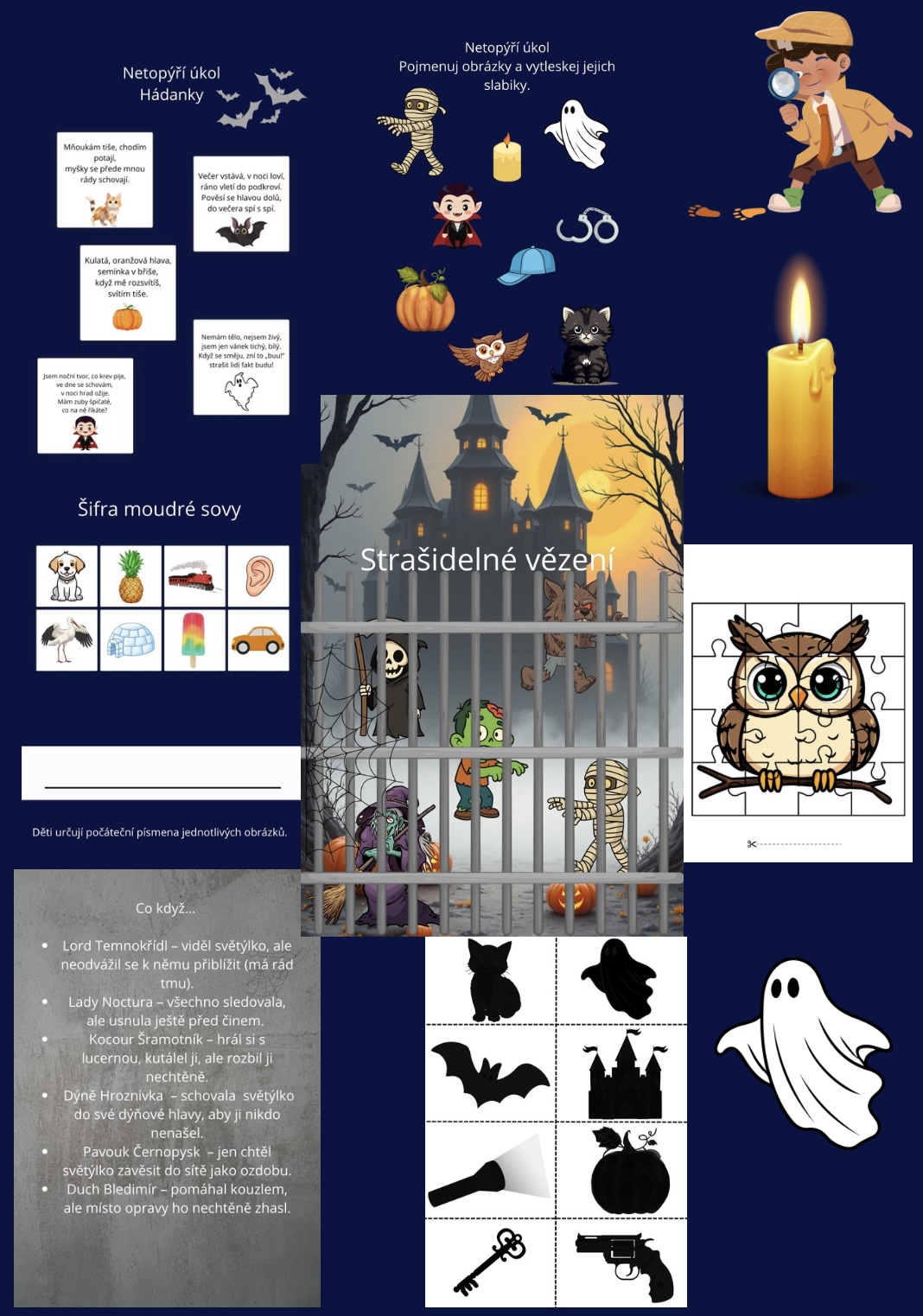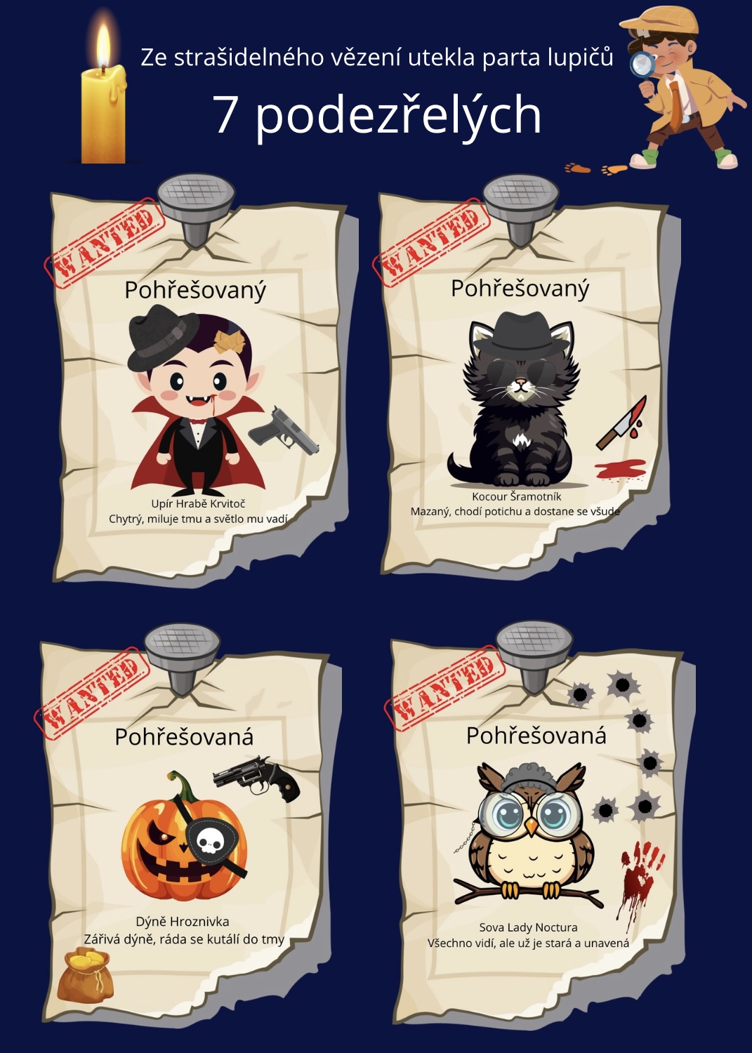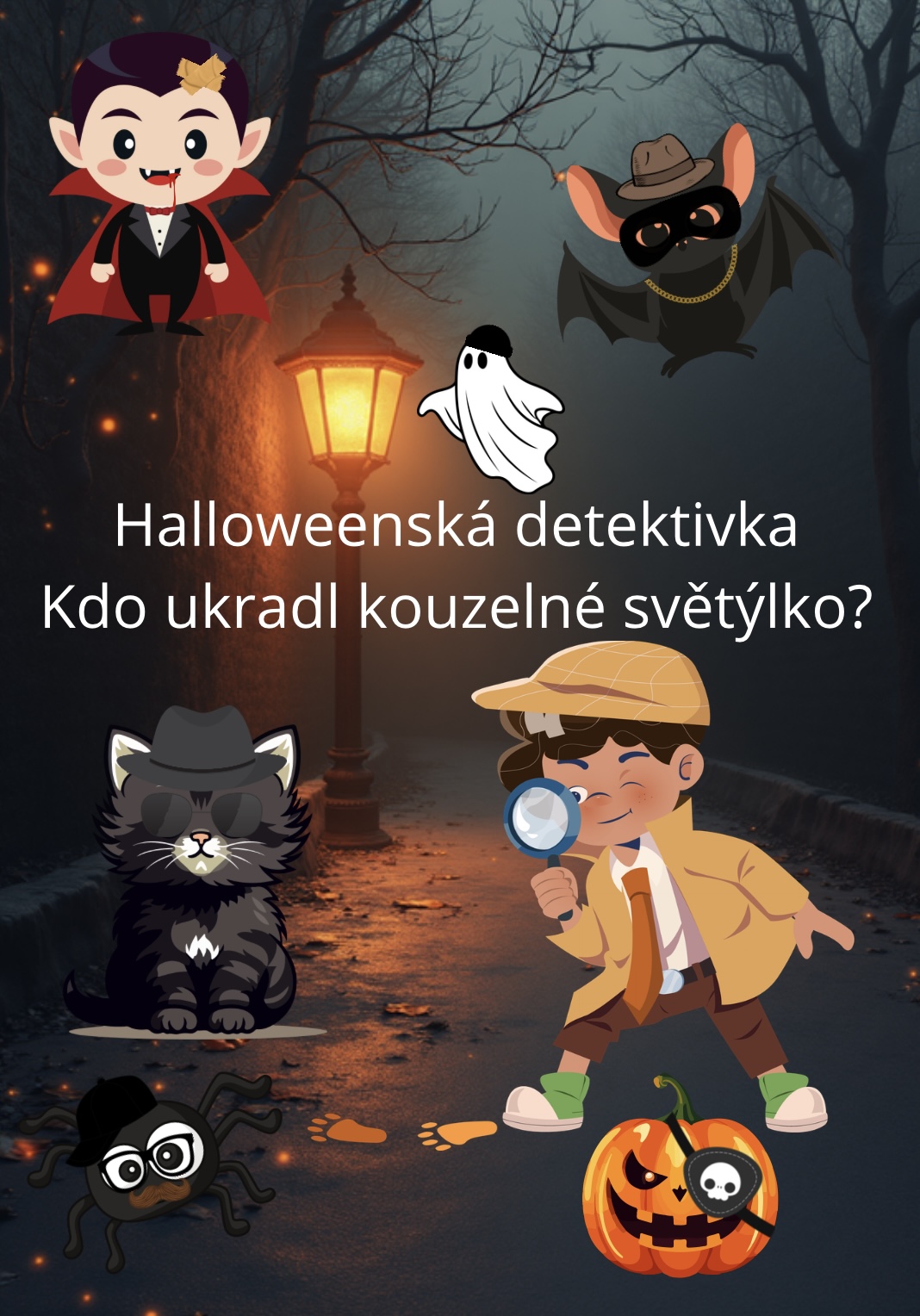 Vydejte se s dětmi na napínavou halloweenskou detektivku! Kdo ukradl kouzelné světýlko? Dýně, netopýr nebo duch? Děti plní zábavné úkoly, získávají indicie a společně odhalí pachatele. Soubor obsahuje příběh, karty podezřelých, hádanky, úkoly i závěrečný diplom. Perfektní hra pro mateřskou školu.
